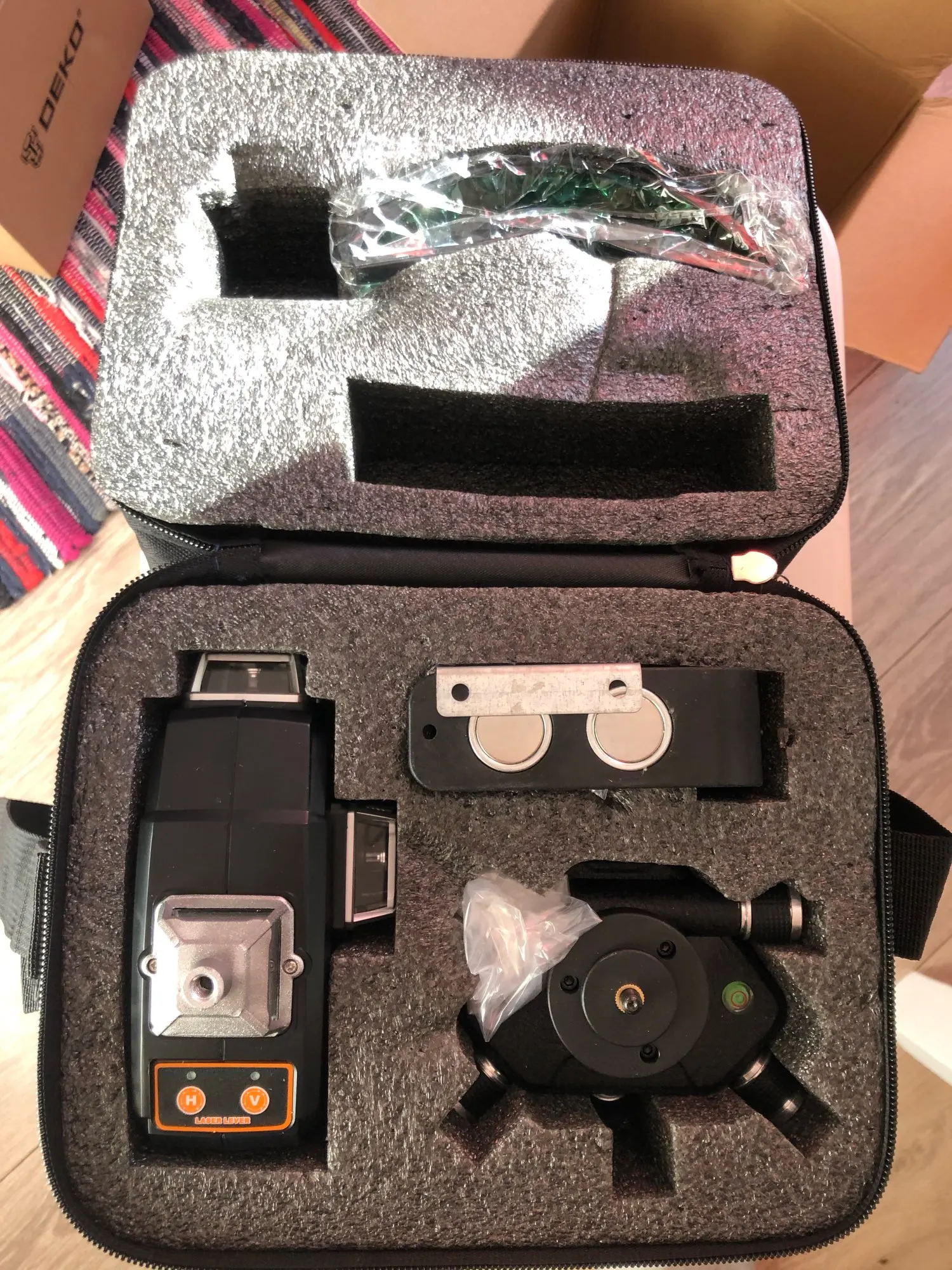 Отличный продукт. Приятно удивлен. Больше, чем выглядит на рекламе. Поставляется в очень хорошо защищенном виде. Поставляется в корпусе cx a, уровень, зеленый, основание с уровнем и заплатками, зарядное устройство, поддержка, если установка с супер сильным магнитом и металлической пластиной с сверлением несколько для легкой фиксации уровня. Без сомнения, очень доволен.