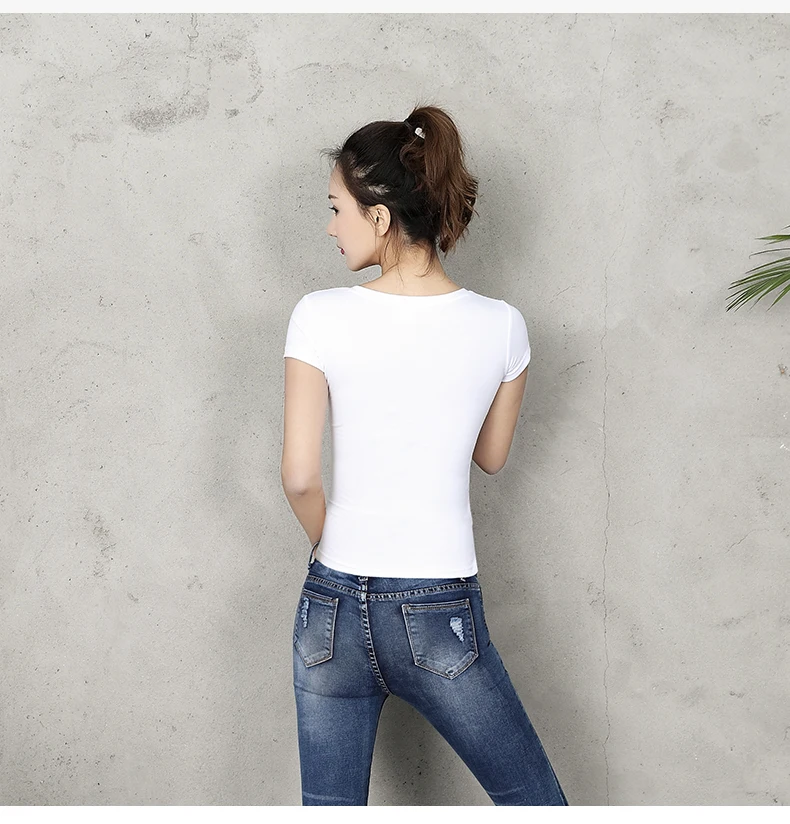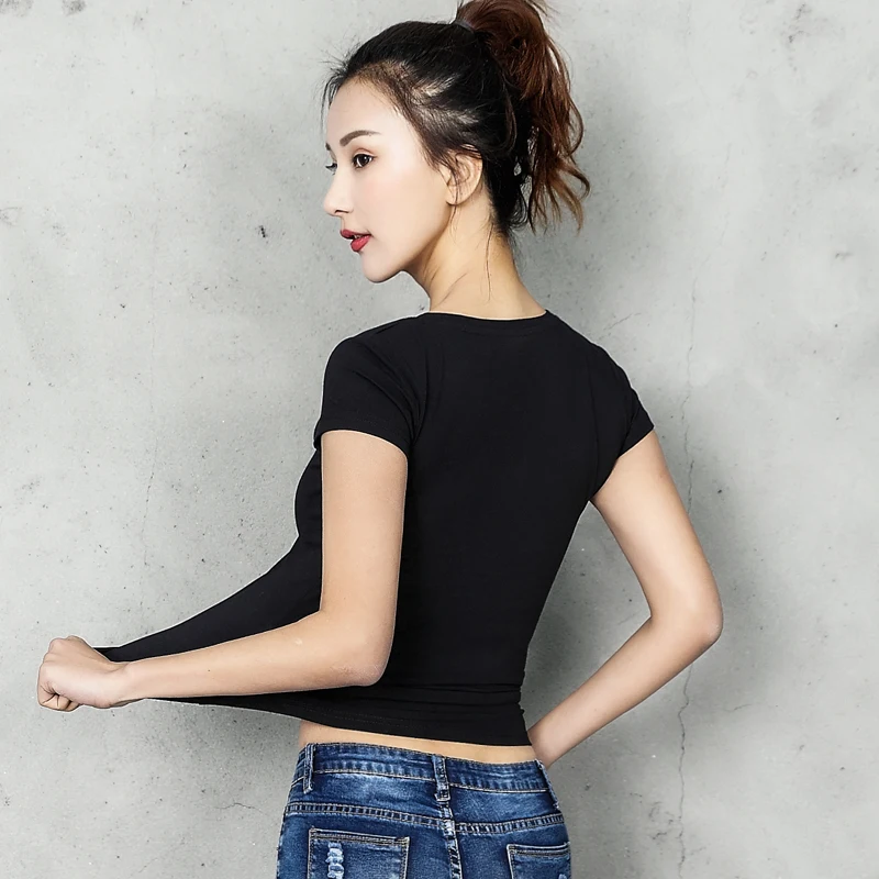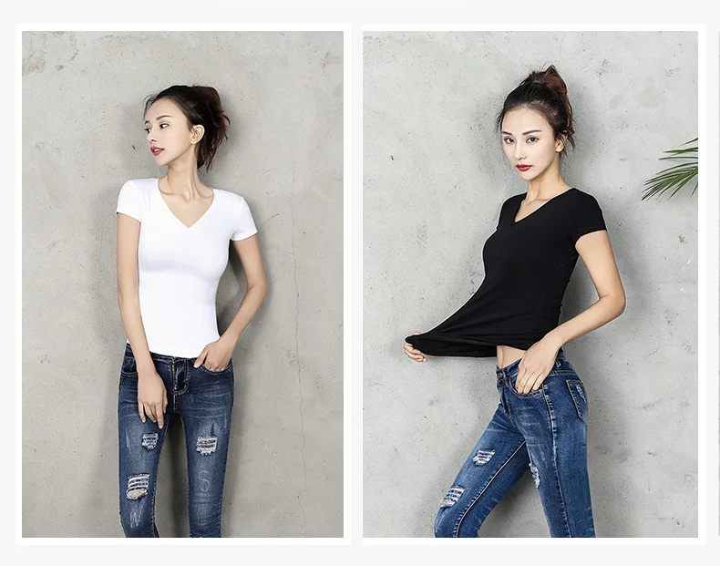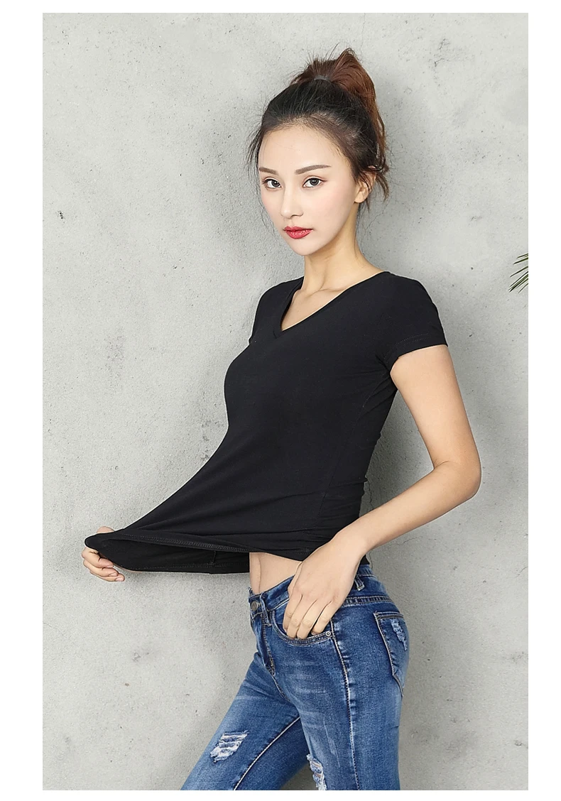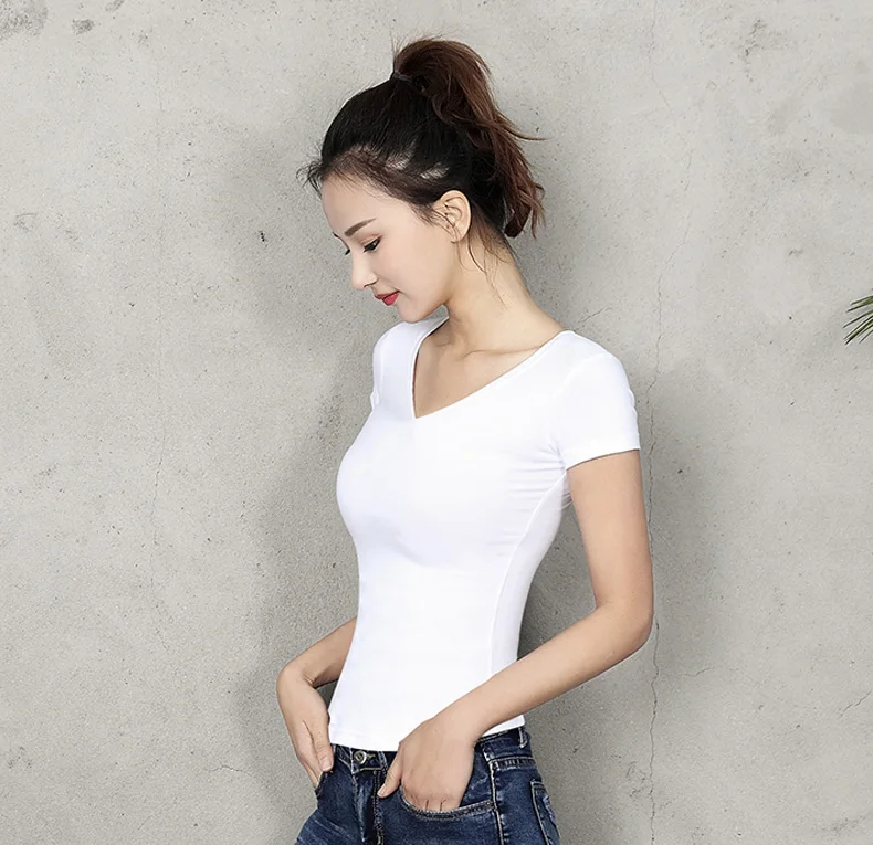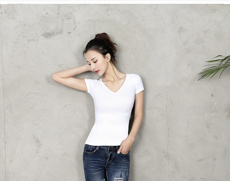 Футболка женская хлопковая однотонная, с V-образным вырезом и коротким рукавом