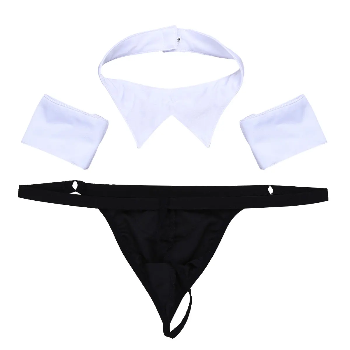 Мужской сексуальный комплект нижнего белья для официанта, горячая микро открытая ягодица, танга, стринги + браслеты с воротником, униформа для игры в моделях