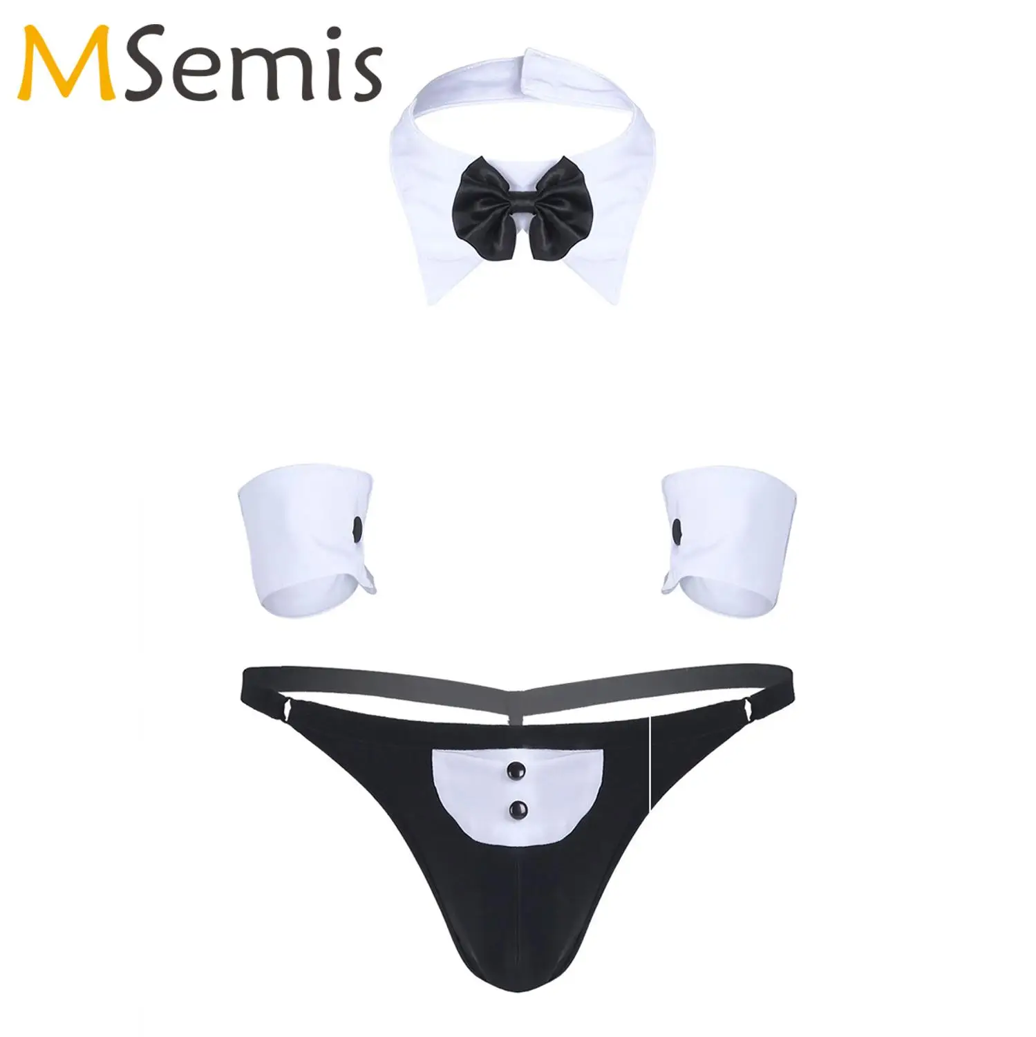 MSemis мужской сексуальный костюм смокинг для официанта, комплект нижнего белья, горячая Распродажа, микро открытая Анальная танга, стринги + ошейник, браслеты, горничная Сисси, униформа для ролевых игр