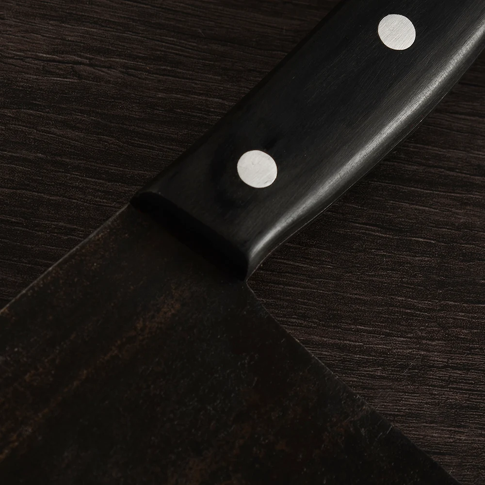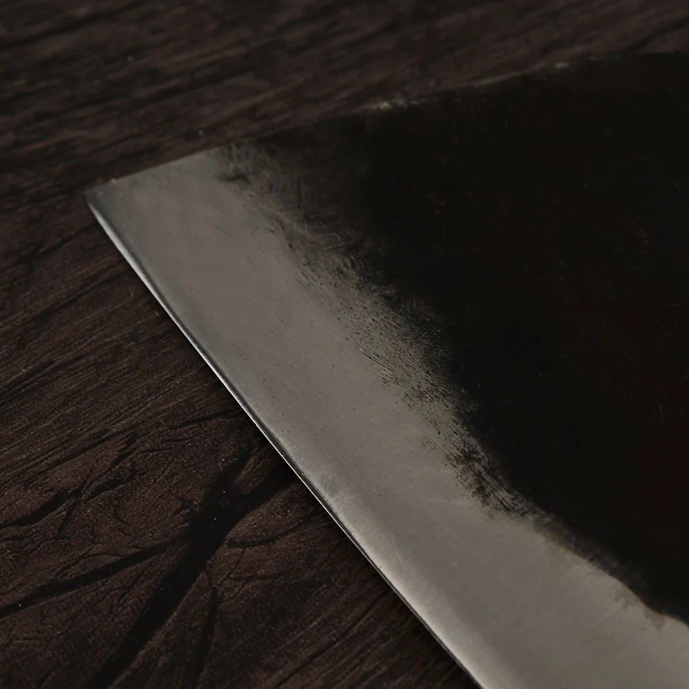 Ширина: 10 см Длина клинка: 17 см Вес: около 490 г Толщина клинка: 5 мм Материал: марганцевая сталь Разбрызгивание закалки: 780 градусов Закалка: 180 градусов-200 градусов Материал: Кованая Высокоуглеродистая сталь ручной работы Характеристики: бритва острая для легкой резки костей Рукоятка: полностью встроенный Стальной хвостовик + дерево + фиксация заклепок Процесс производства: при закалке-зажиме стали-закалке и других операциях непрерывного цикла.