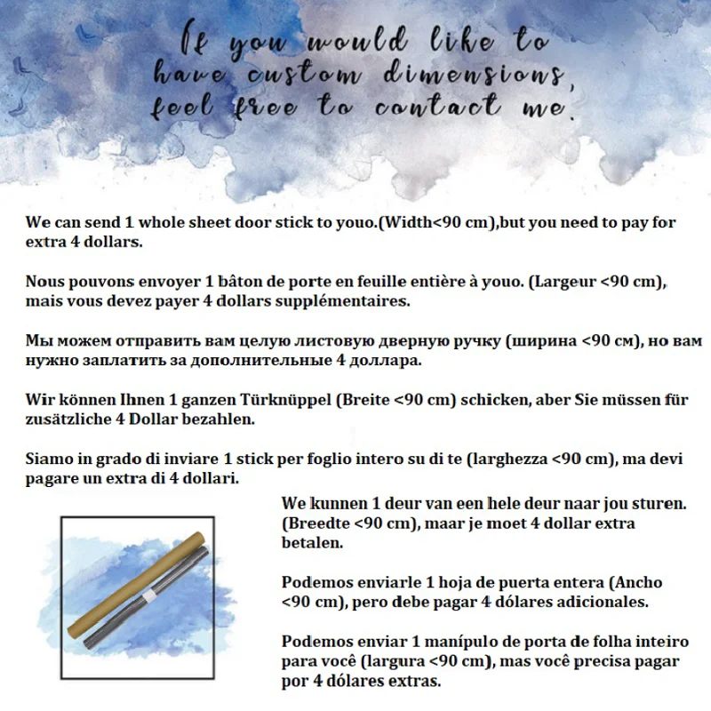 Указанная выше информация о целой посылка подходит для наклейки dorr, ширина которой составляет менее 90 см. Если у вас есть специальный запрос, пожалуйста, свяжитесь с нами, чтобы найти другое решение.