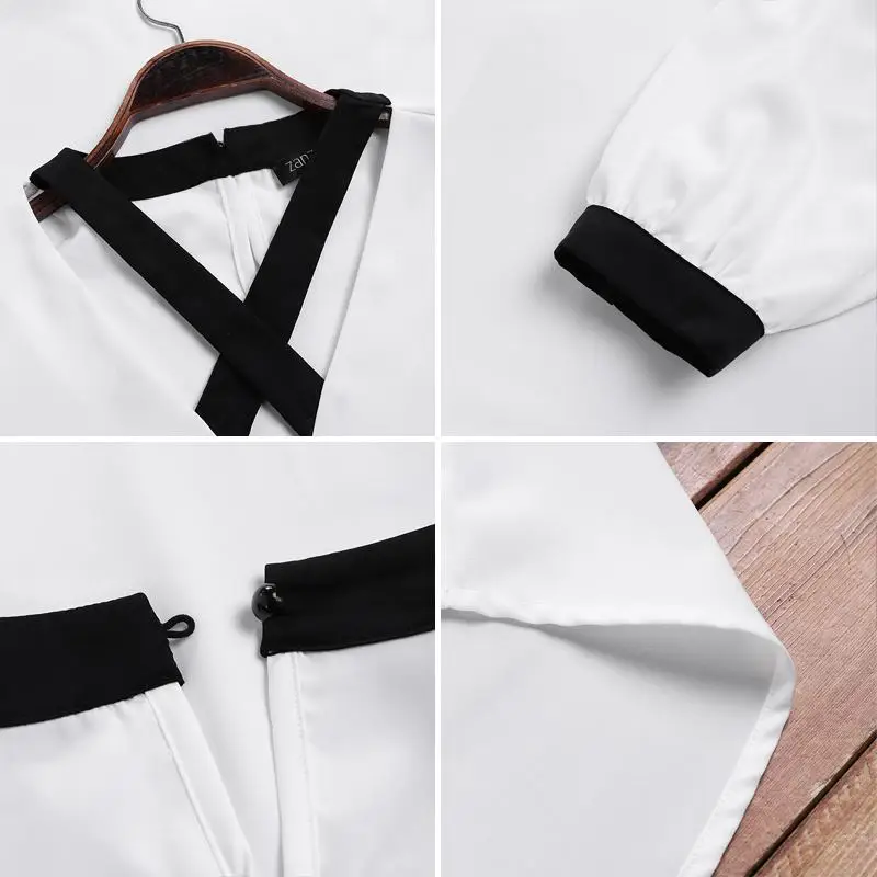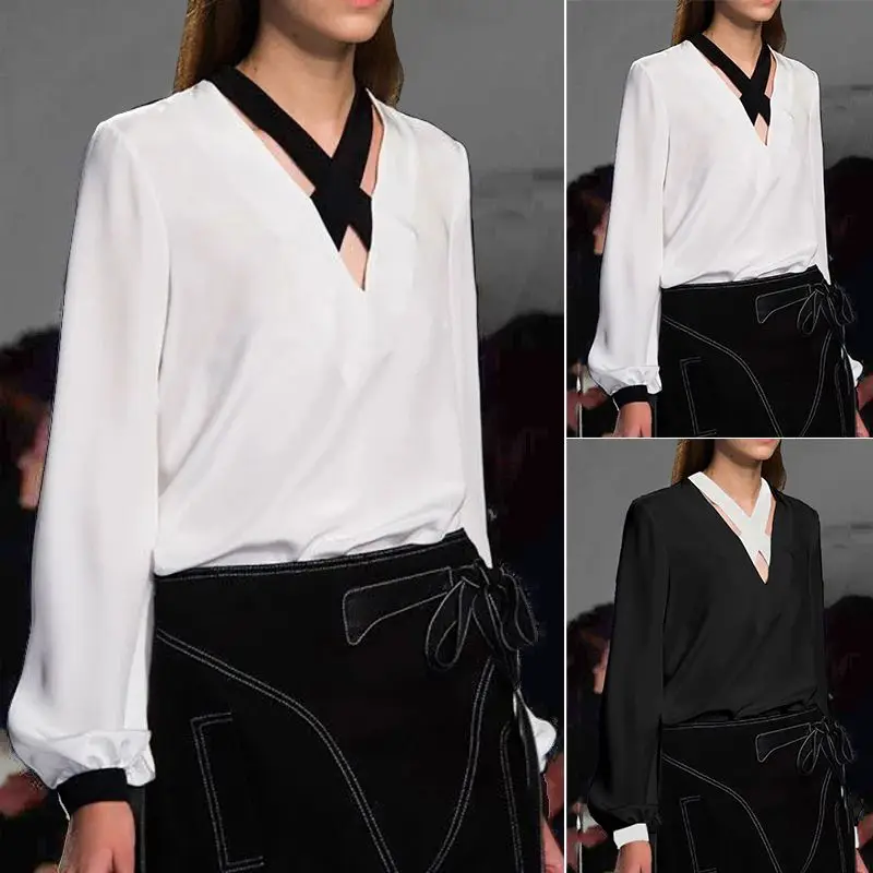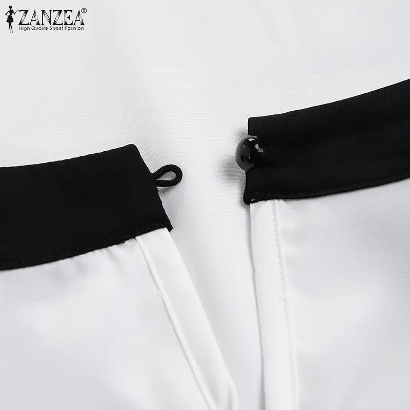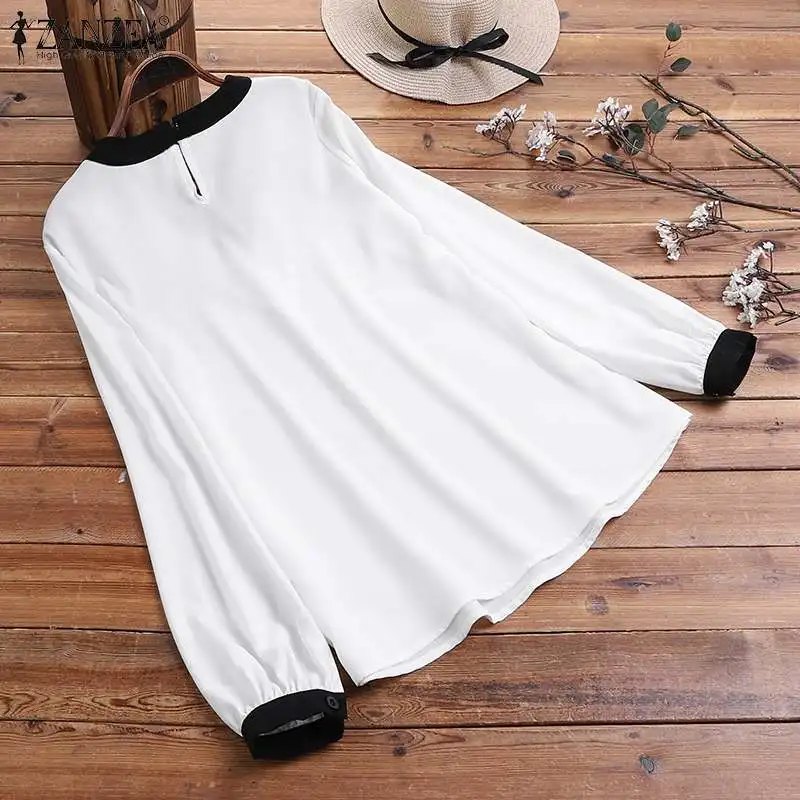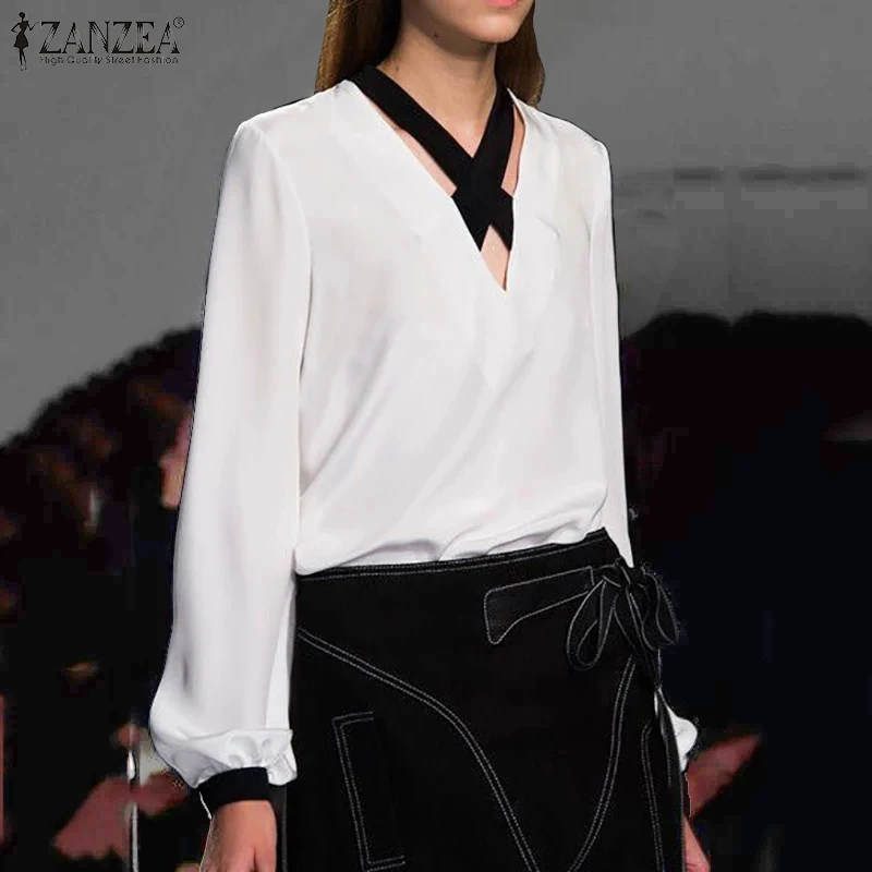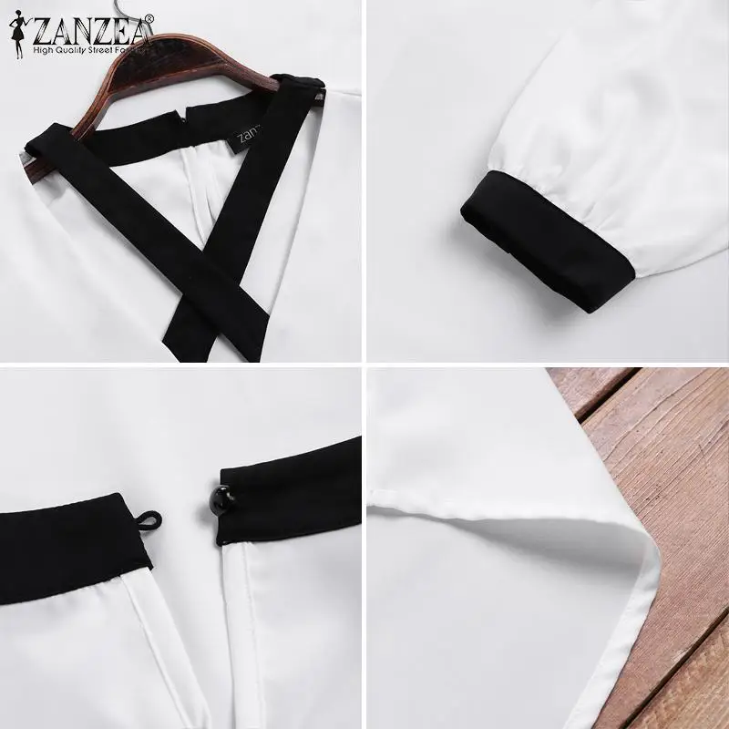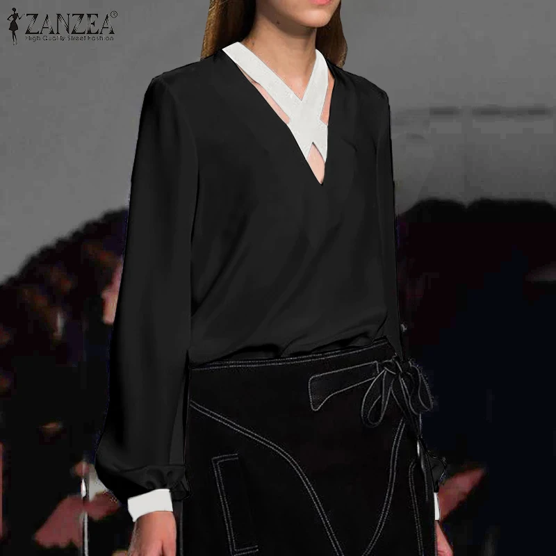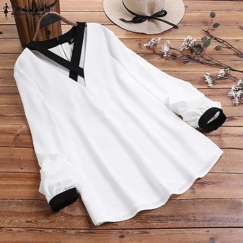 Модель ZANZEA 2020 года, модные женские блузки с V-образным вырезом, шифоновые топы в стиле пэчворк, элегантная офисная туника, Блузки Рубашки с буфами на рукавах 5XL 7