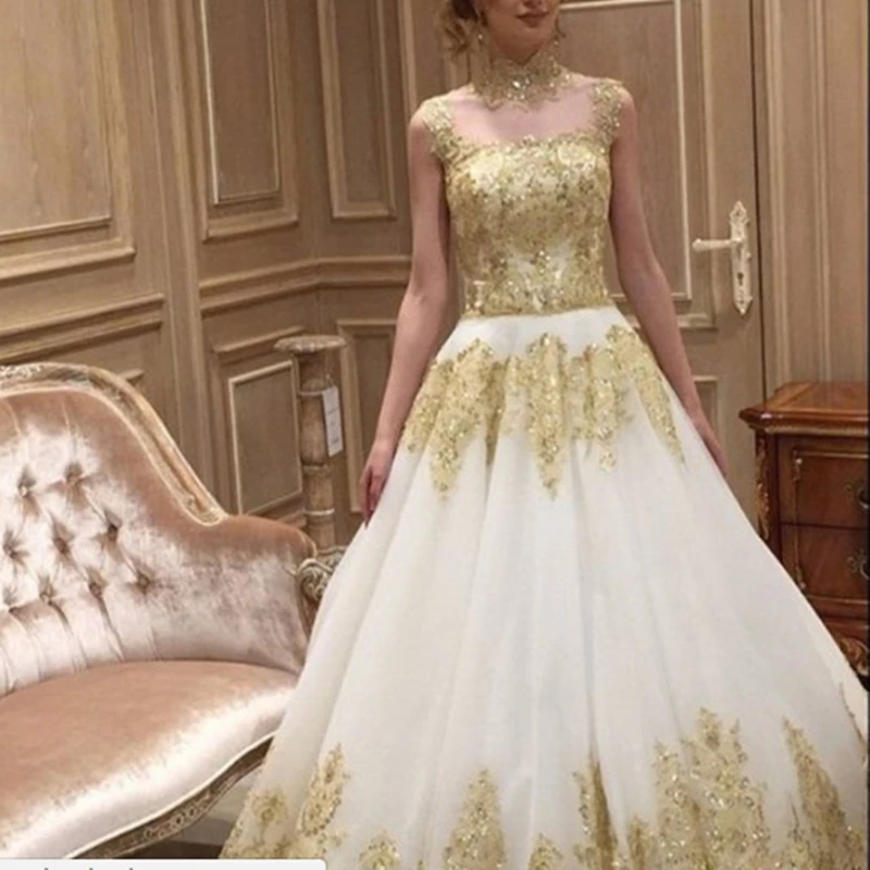 Золотые кружевные свадебные платья с высоким воротом, без рукавов, с блестящей аппликацией, Длинные свадебные платья, роскошные платья принцессы, Vestido De Noiva