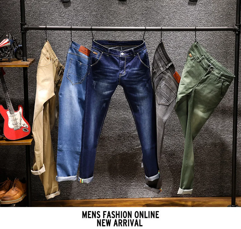 Новинка 2019, модные мужские джинсы, облегающие эластичные брюки-карандаш цвета хаки, синий, зеленый, хлопковые брендовые классические джинсы, Мужские обтягивающие джинсы