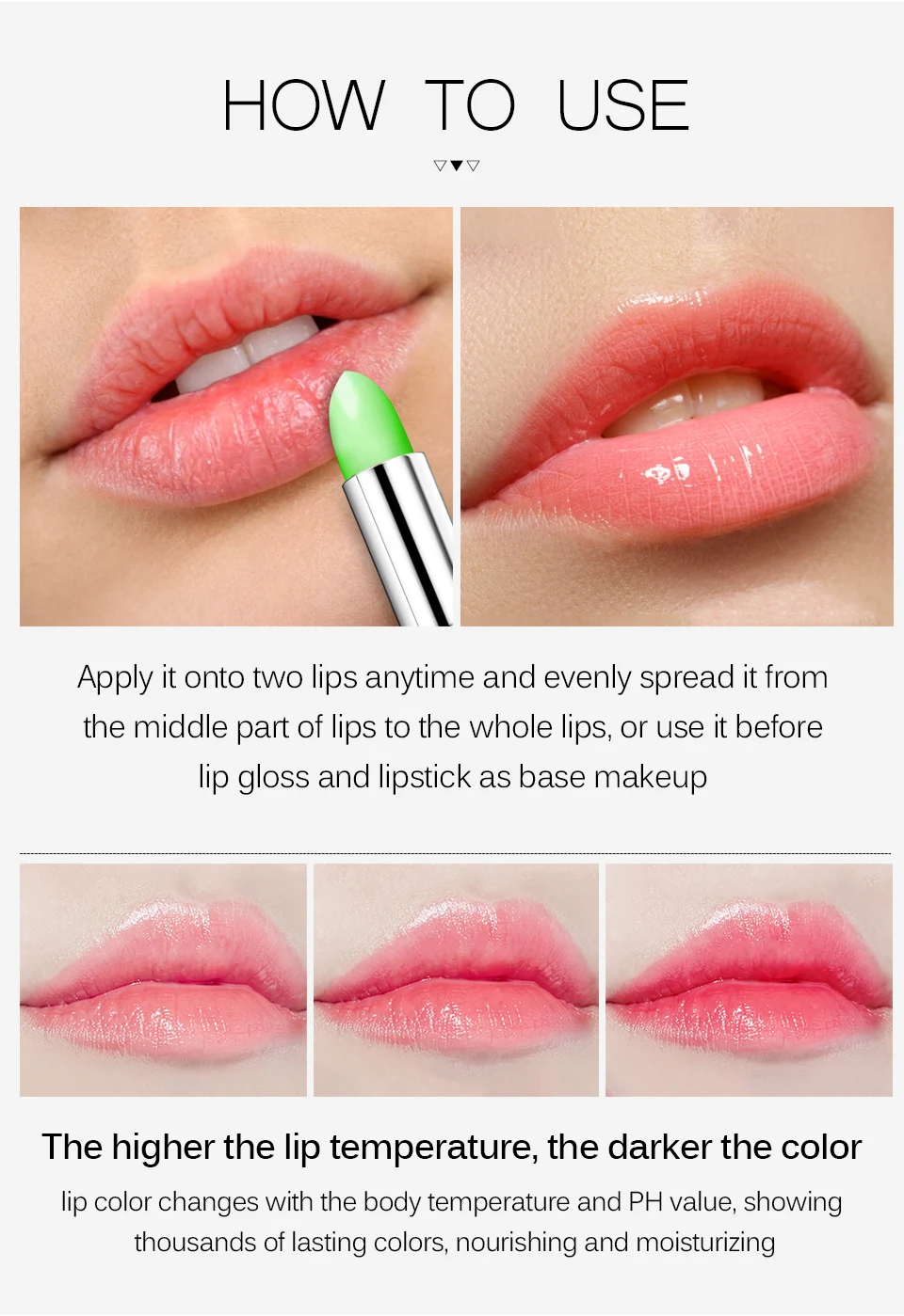 1. Нанесите его на две губы в любое время и равномерно распределите его от средней части губ до всех губ, или используйте его перед блеском для губ и помадой в качестве основы для макияжа2. Чем выше температура губ, тем темнее цветЦвет губ меняется с температурой тела и значением PH, показывая тысячи стойких цветов, питательный и увлажняющий