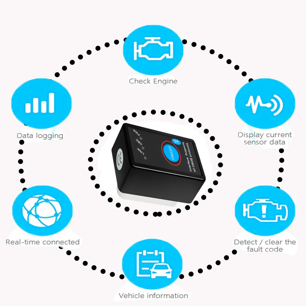 1) чтение диагностических кодов неисправностей, как общих, так и конкретного производителя, и вывод их значений (определения более 3000 общих кодов в базе данных).