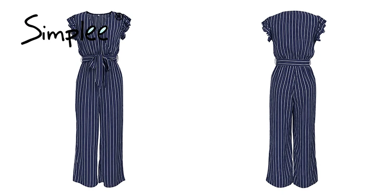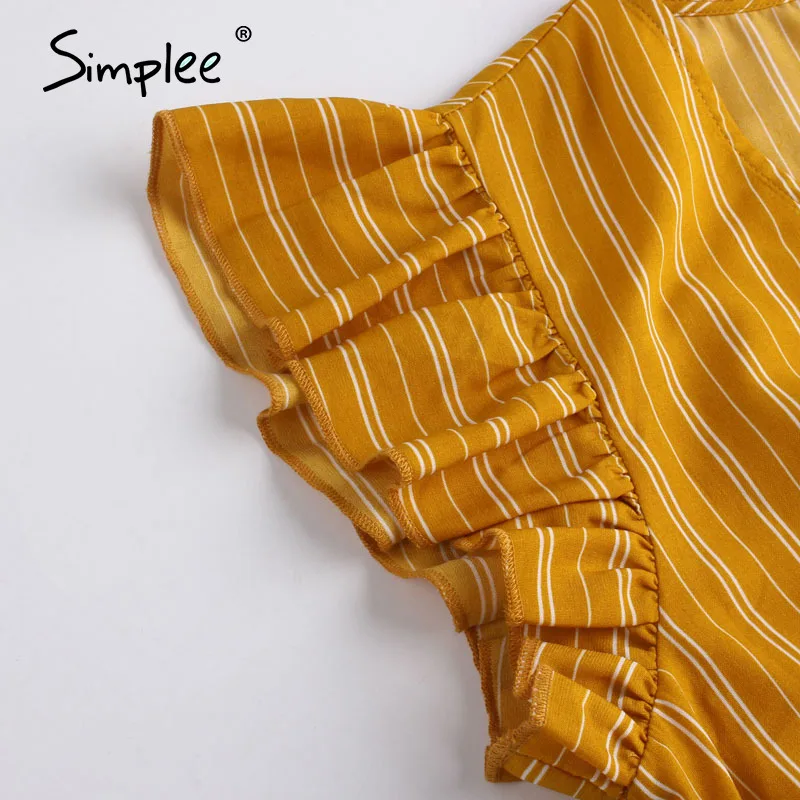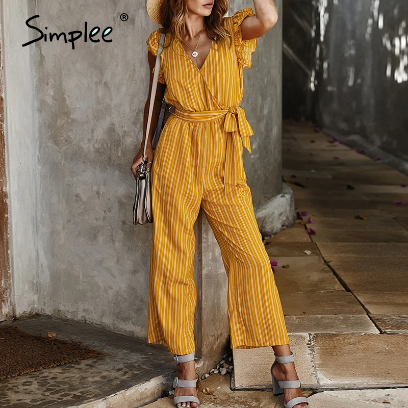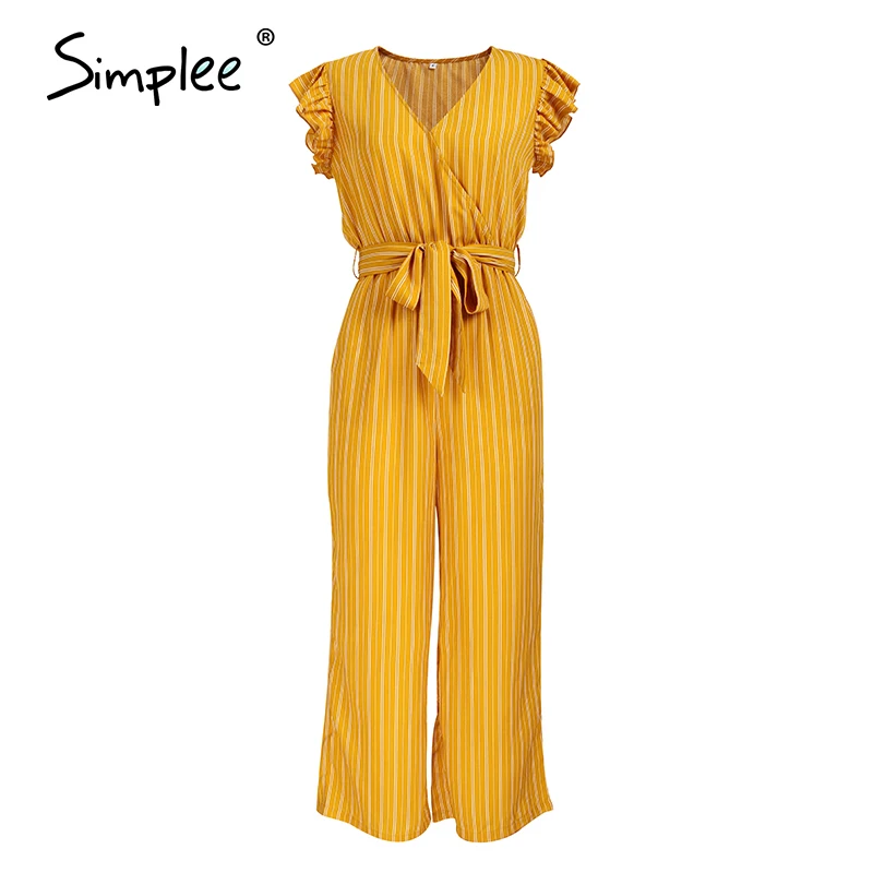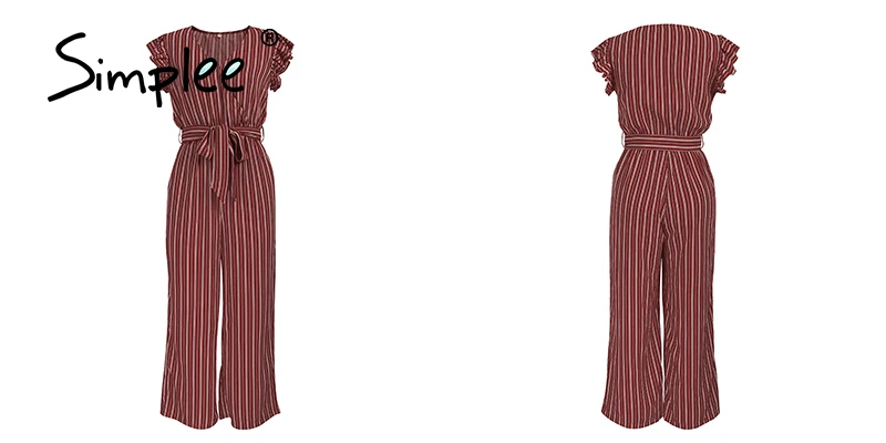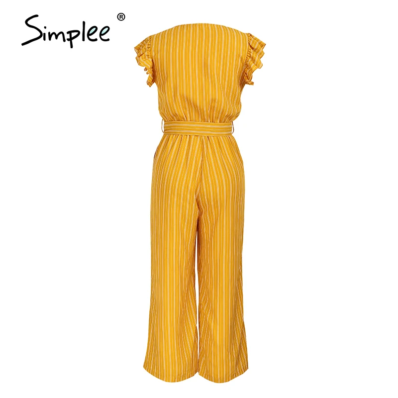 Simplee элегантный полосатый принт, женский комбинезон с оборками на рукавах и v-образным вырезом, хлопковый комбинезон, уличная одежда, пояс, женский комбинезон с карманами