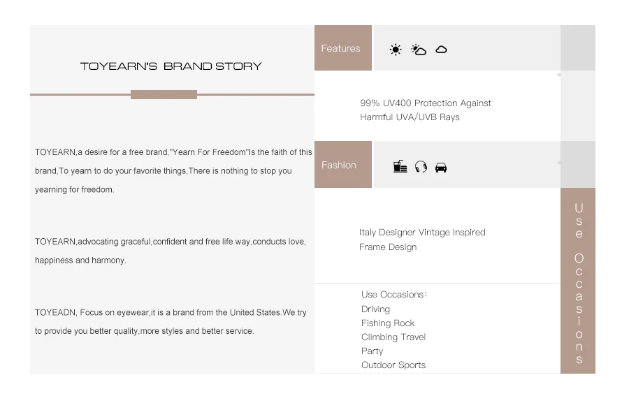 Product Function100% UV400 Protection Against Harmful UVA/U