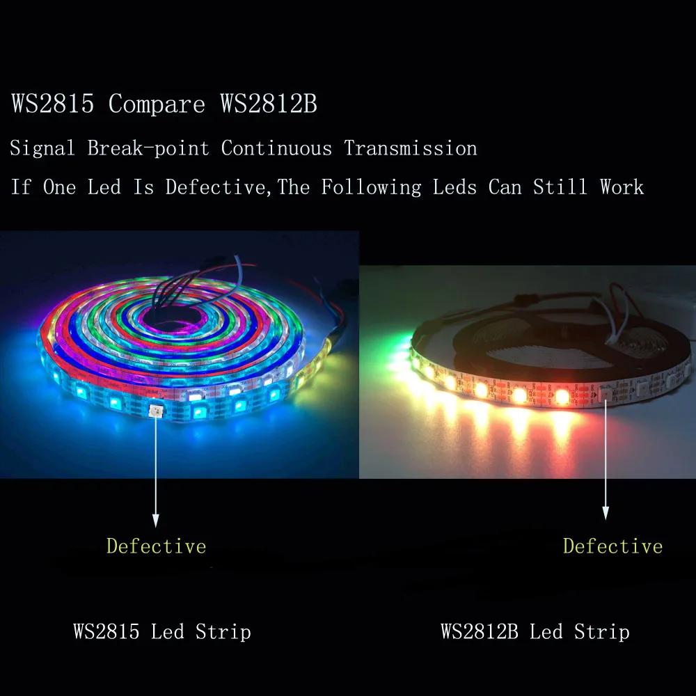 WS2815 светодиодный полосы похож больше нравится версия 5V WS2813 светодиодный полосы, разработанный с одна жила провода для передачи данных и резервного копирования данных провода. Непрерывная передача сигнала. Если поврежден один светодиодный индикатор, может работать следующий светодиодный индикатор.
