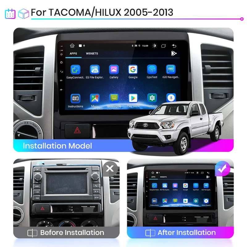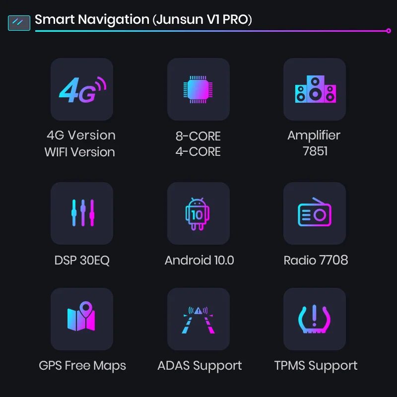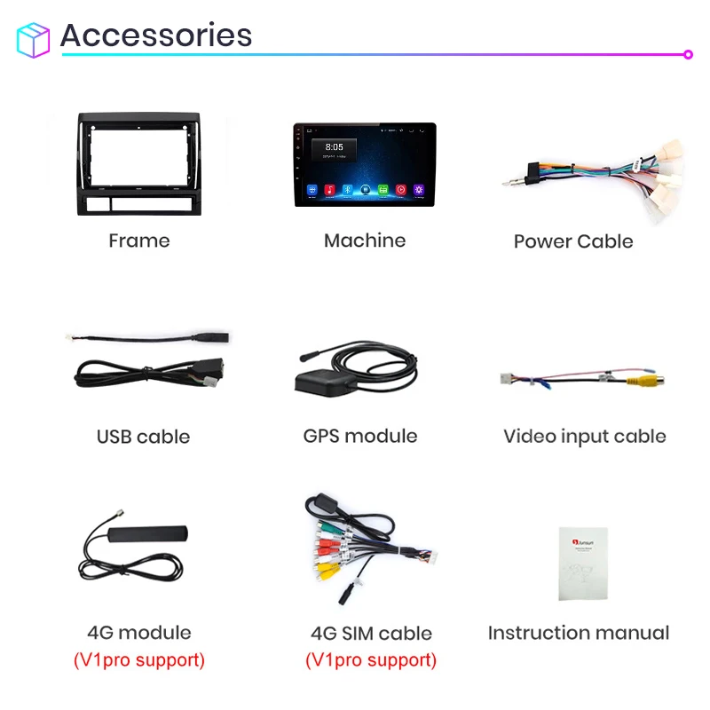 > Junsun V1 для TOYOTA TACOMA/HILUX 2005-2013 функция9 дюймов 2.5D емкостный экран + четырехъядерный процессор 1,2 ГГц + DDR3 1 Гб (2 Гб опционально) флэш + 16 Гб памяти (32 Гб опционально) + встроенный Wifi (сеть 4G опционально) + gps-навигация (бесплатное обновление карты, только Поддержка бренда Junsun) + Рулевое управление + зеркальная связь + Bluetooth + Встроенный микрофон + FM/AM + RDS (опционально) + Поддержка функции USB ADAS DVR + Европейская функция DAB + 1080P Vedio Play + HD 1024*600 + система мониторинга давления в шинах > Язык экранного менюРусский, английский, испанский, итальянский, французский, немецкий, китайский, эстонский, польский, филиппинский, финский, корейский, голландский, хорватский, латышский, литовский, румынский, норвежский, португальский, японский, шведский, тайский, турецкий, украинский, венгерский. > 24 ч * 7 поддержка услугВ Junsun Наша цель-продолжать усердно работать, чтобы сделать инновационное оборудование и программное обеспечение автомобильного мультимедийного Проигрывателя радио, чтобы дать вам этот персонализированный опыт.Мы предоставляем обновления для прошивки, программного обеспечения, gps-навигационных карт бесплатно.