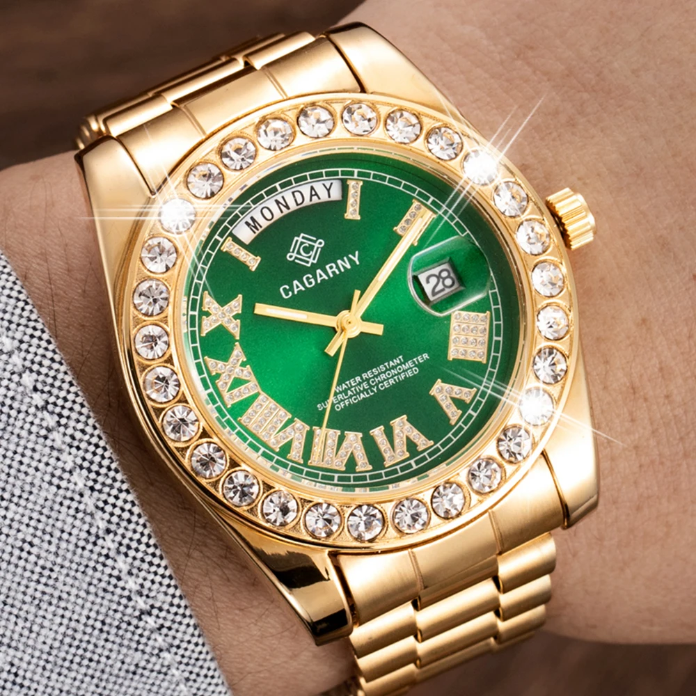 Роскошные золотые часы с кристаллами и бриллиантами, мужские кварце...
