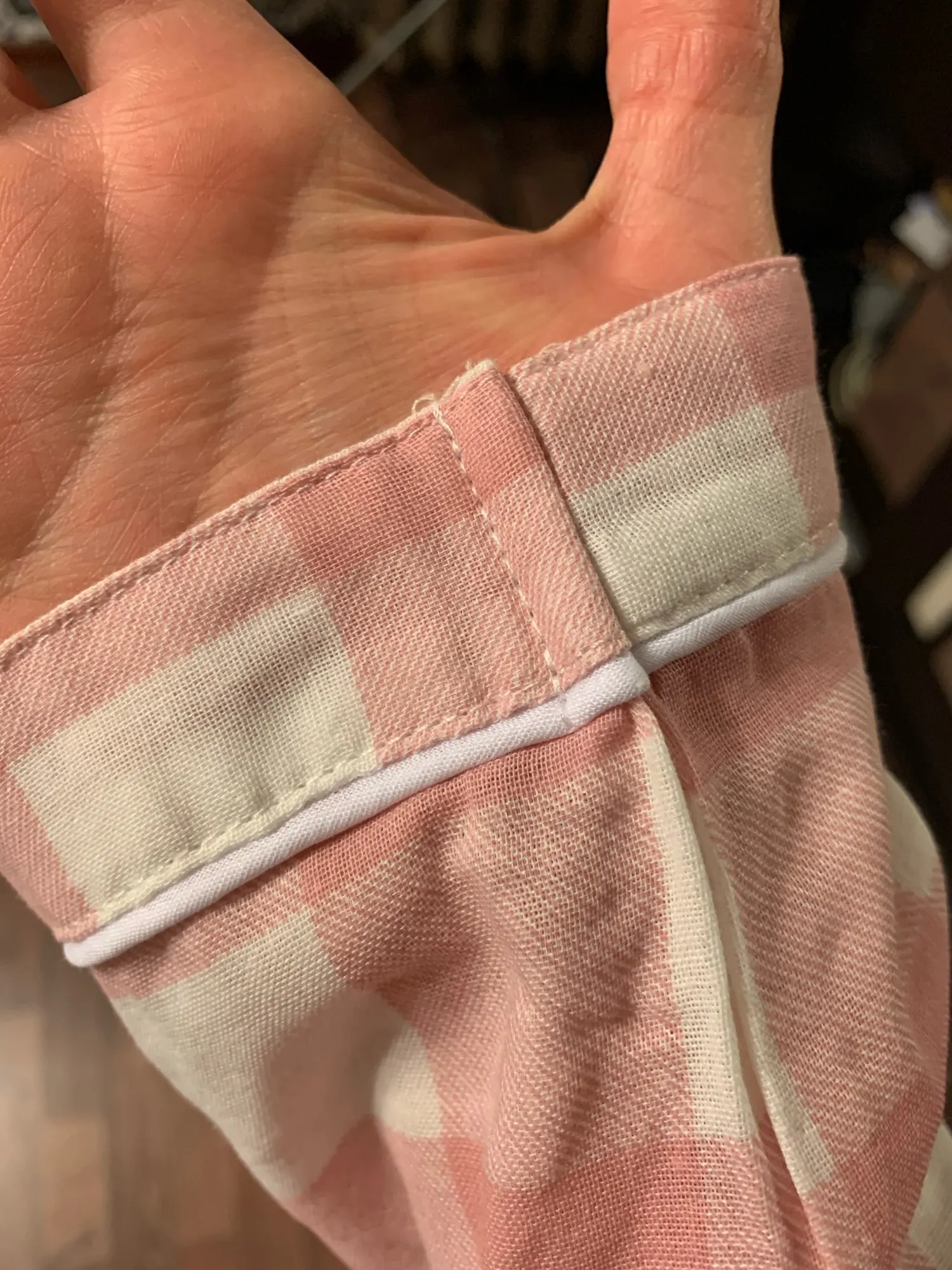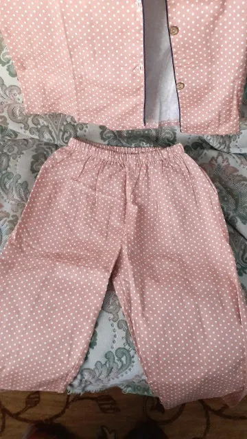 Цвет пижамы светло-розовый, приятный. Швы прошиты хорошо. качество ткани - похоже на хлопок или бязь. Если нижнее белье под низом темное, то немного просвечивает через пижаму. Ткань приятная к телу. Единственный минус, очень завышена посадка на талии и пах. Из-за этого штаны получаются укороченными. На свой рост 164 см и параметры 90-65-93 взяла размер L. Сел свободно.
