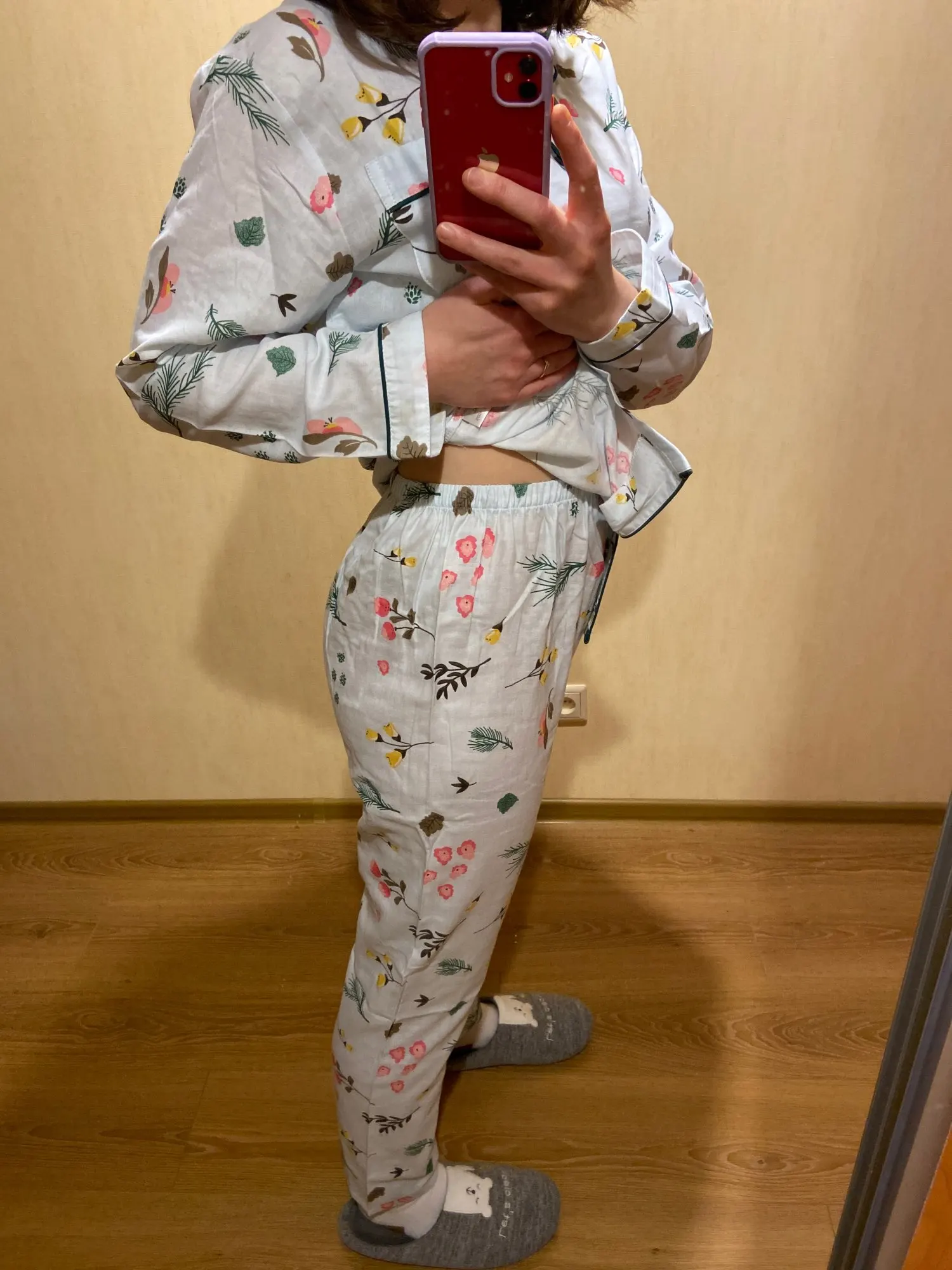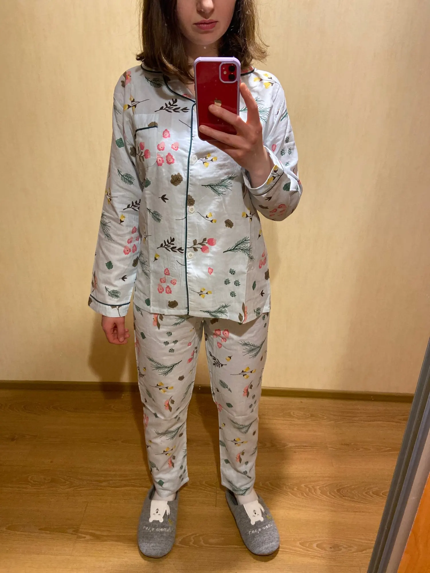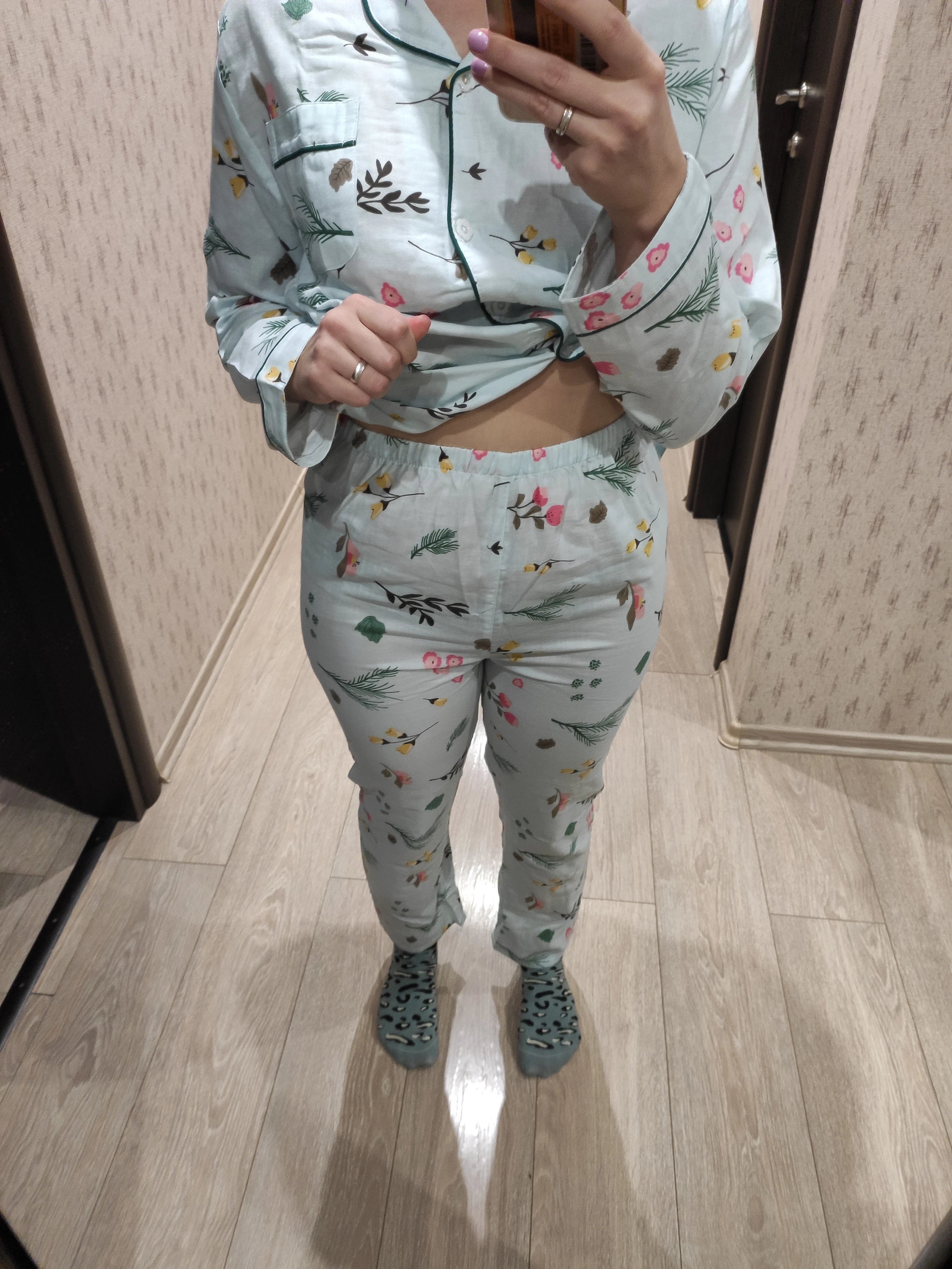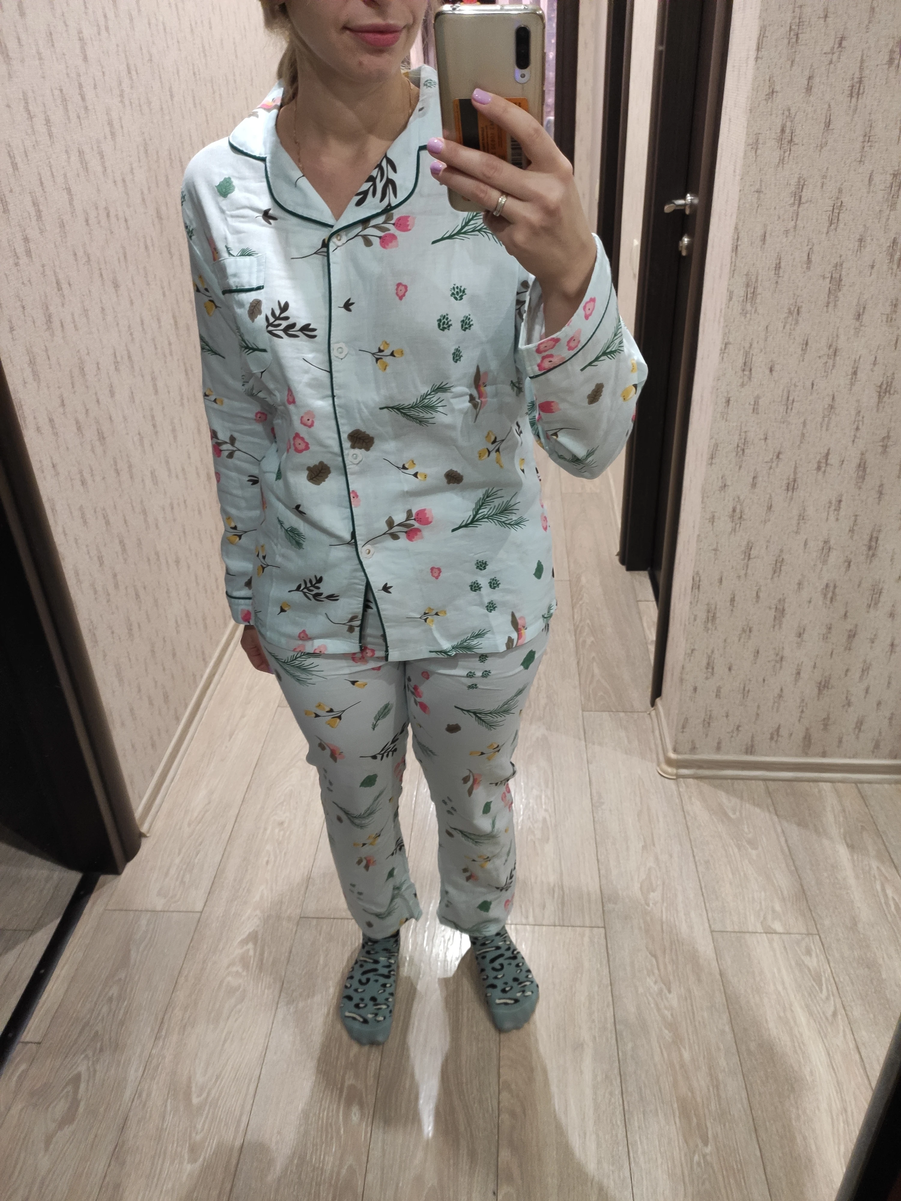 Пижама не плохая, свободного кроя. На рост 160 и вес 49 сел хорошо, правда тем, кто любит приталенный силуэт, вверх точно не подойдёт, слишком объемный. И пуговки цветочки это, конечно, на большого любителя