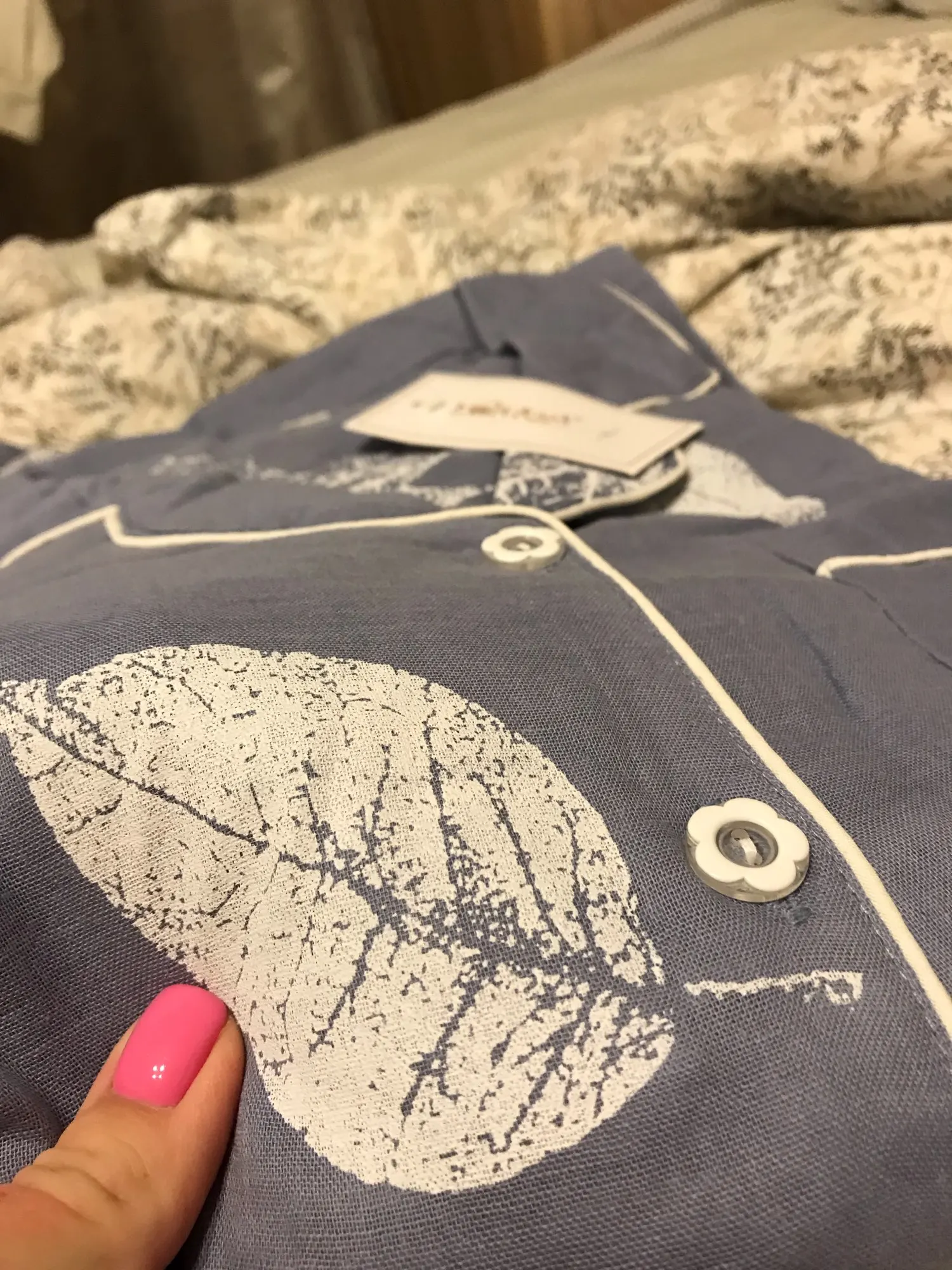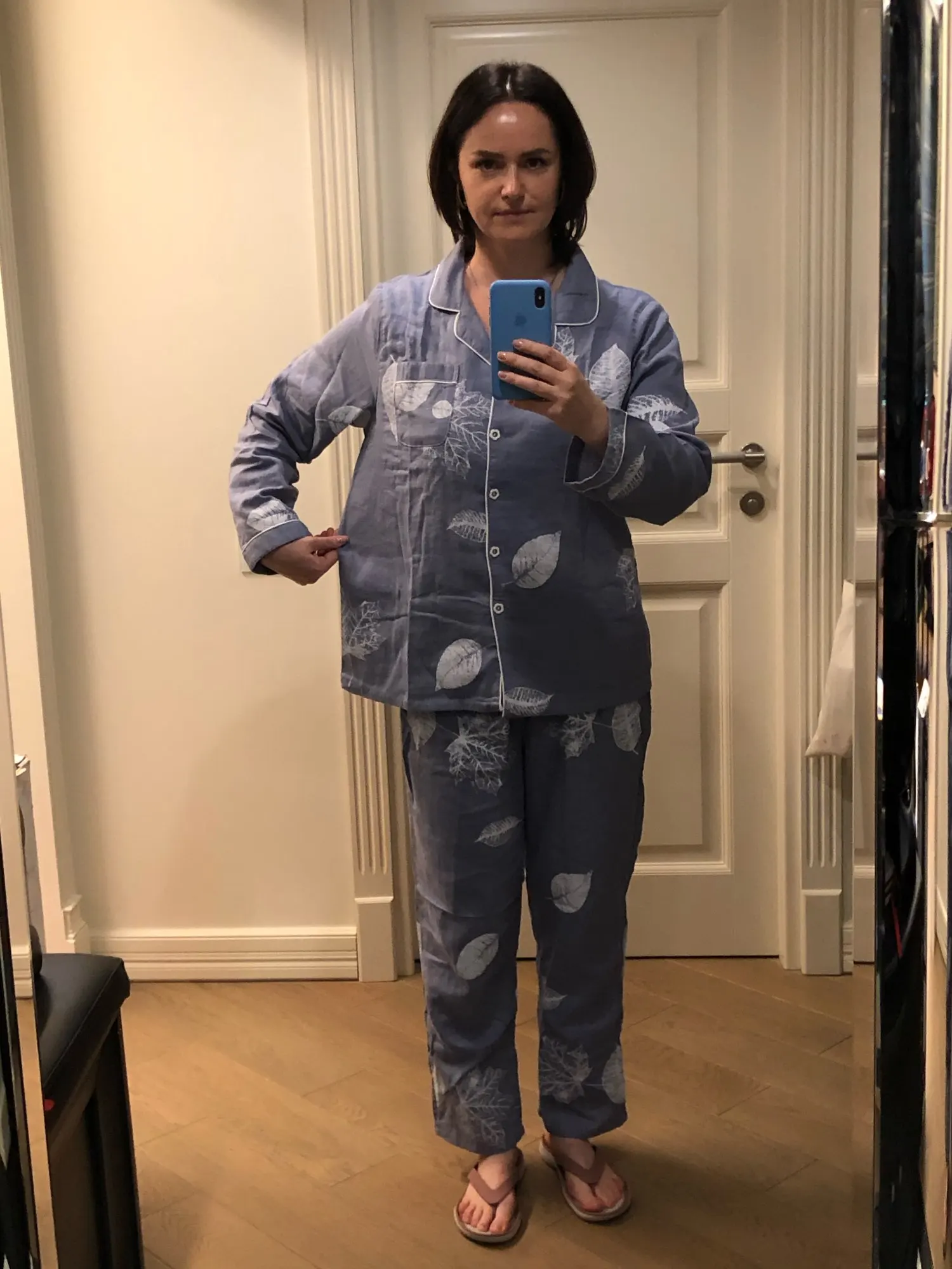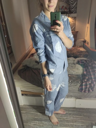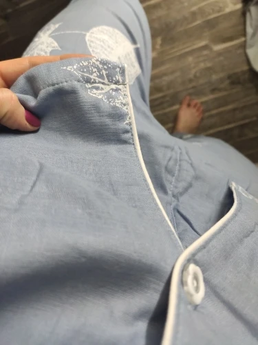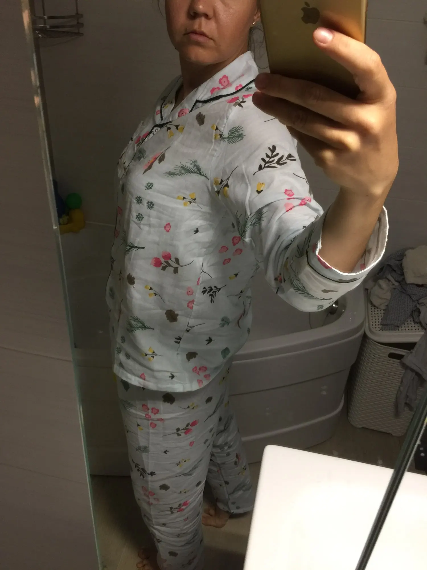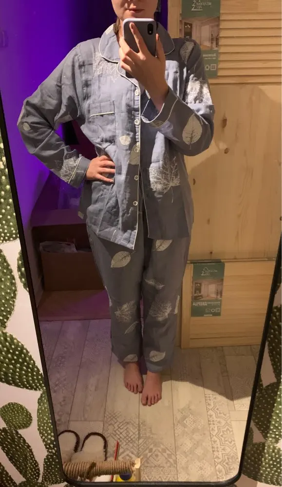 Пижама не плохая, свободного кроя. На рост 160 и вес 49 сел хорошо, правда тем, кто любит приталенный силуэт, вверх точно не подойдёт, слишком объемный. И пуговки цветочки это, конечно, на большого любителя