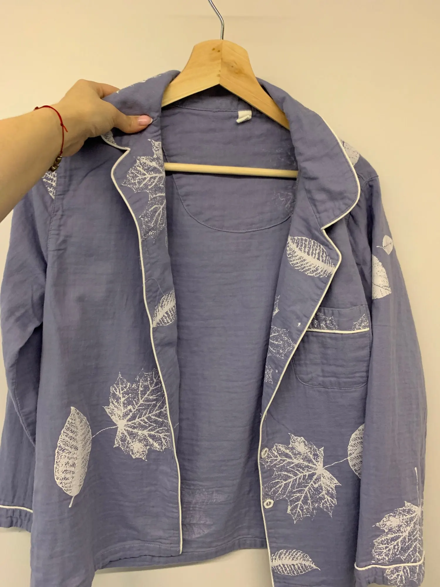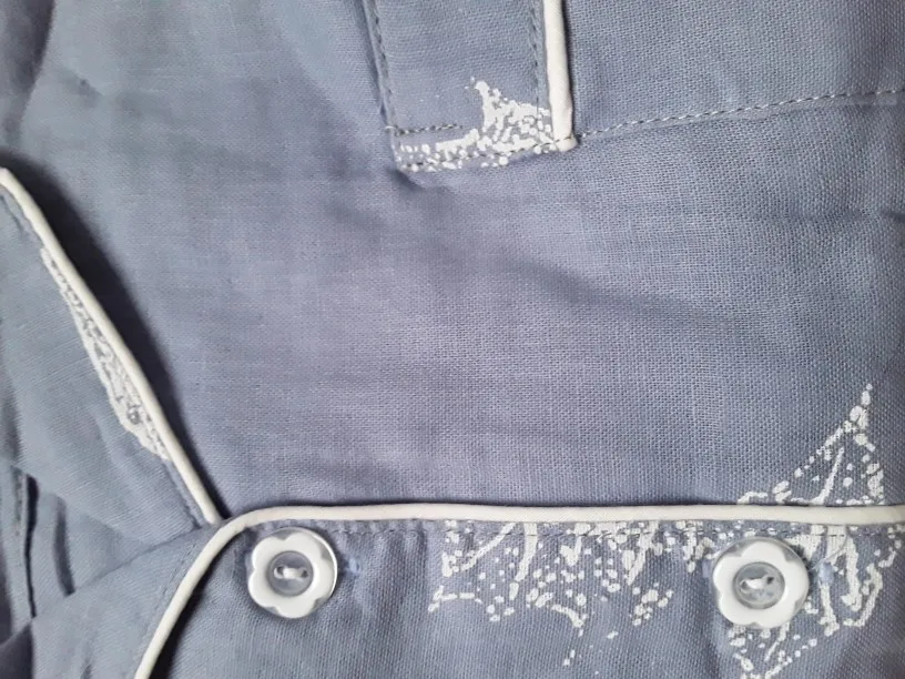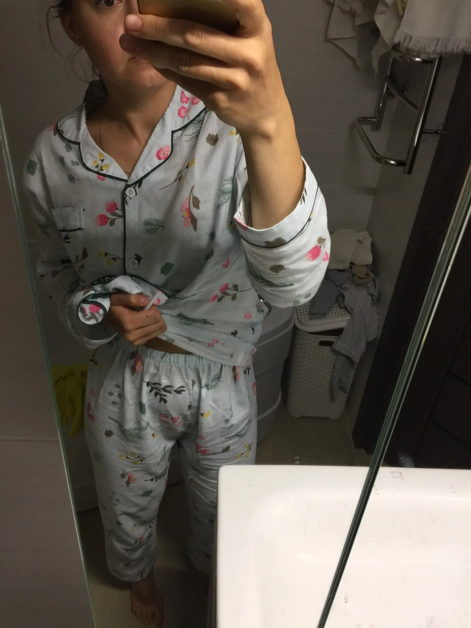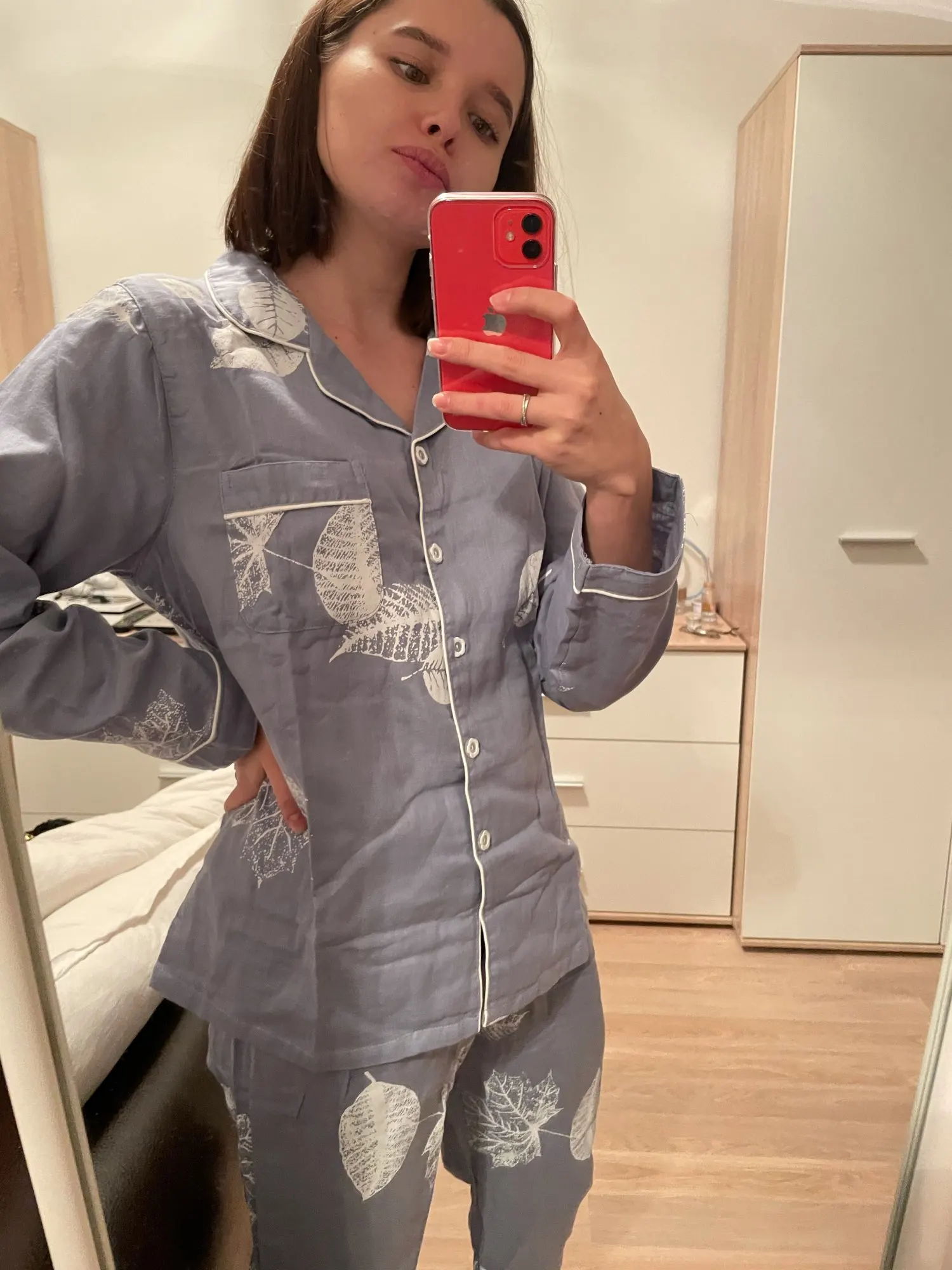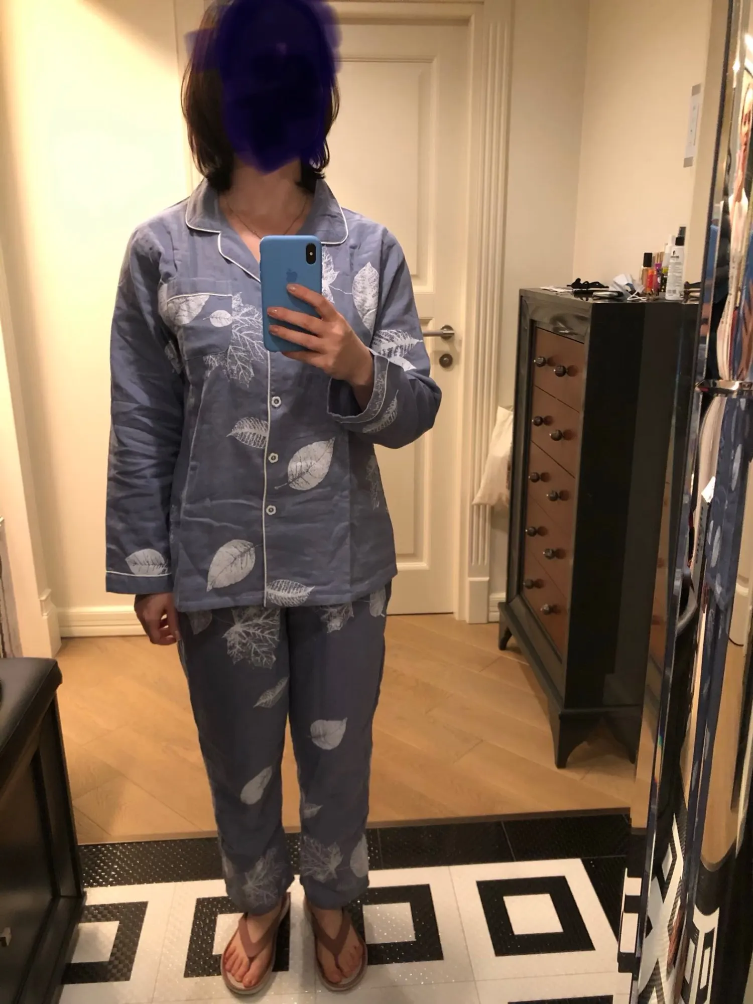 Пижама не плохая, свободного кроя. На рост 160 и вес 49 сел хорошо, правда тем, кто любит приталенный силуэт, вверх точно не подойдёт, слишком объемный. И пуговки цветочки это, конечно, на большого любителя
