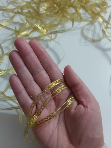 4mm ancho. Longitud 18,25m. Dorado brillante. Muy bonito. Tiene algunos defectos de fabricación pero para el uso que le daré está muy bien. Envío rápido
