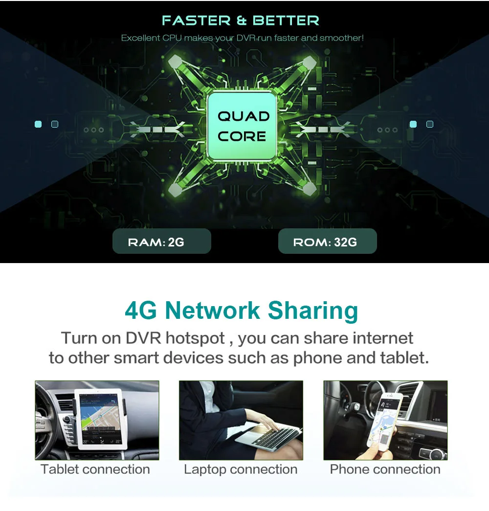 Поездка скучная? Встроенный разъем для микро-SIM-карты 4G обеспечивает постоянное подключение к Интернету, необходимое для работы приложений, просмотра веб-сайта, просмотра фильмов в любое время в любом месте.Но WiFi по-прежнему является автоматическим приоритетом. Когда Wi-Fi доступен, видеорегистратор автоматически переключится в режим Wi-Fi и воспользуется бесплатным Wi-Fi для сохранения данных 4G.