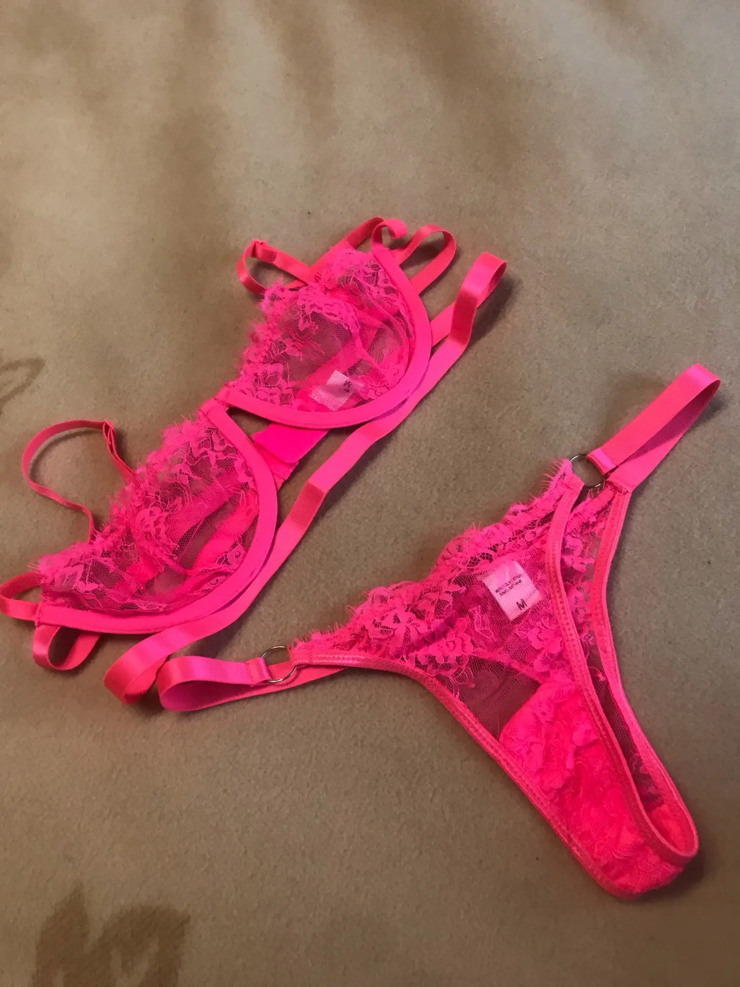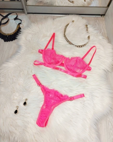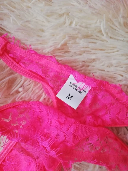Очень красивый комплект! На объём груди 75B размер М подошёл прекрасно. Розовый цвет просто огонь!) покупкой довольна на все 100