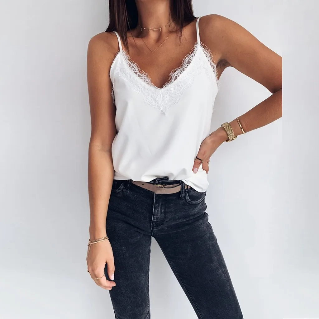 Женские кружевные топы на бретельках с v-образным вырезом, повседневные однотонные рубашки без рукавов, блузки