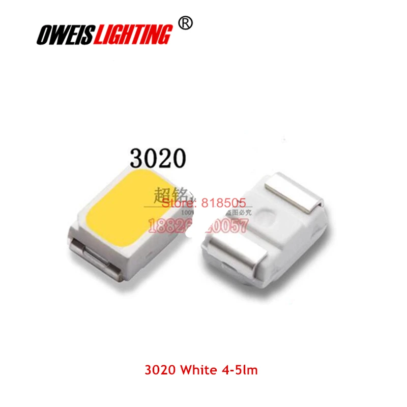 100 шт., белые светодиоды SMD 4-5 лм, 3020-6000 K, 7000-2,8 В, 20 мА, 3,0*3,0*2,0 мм