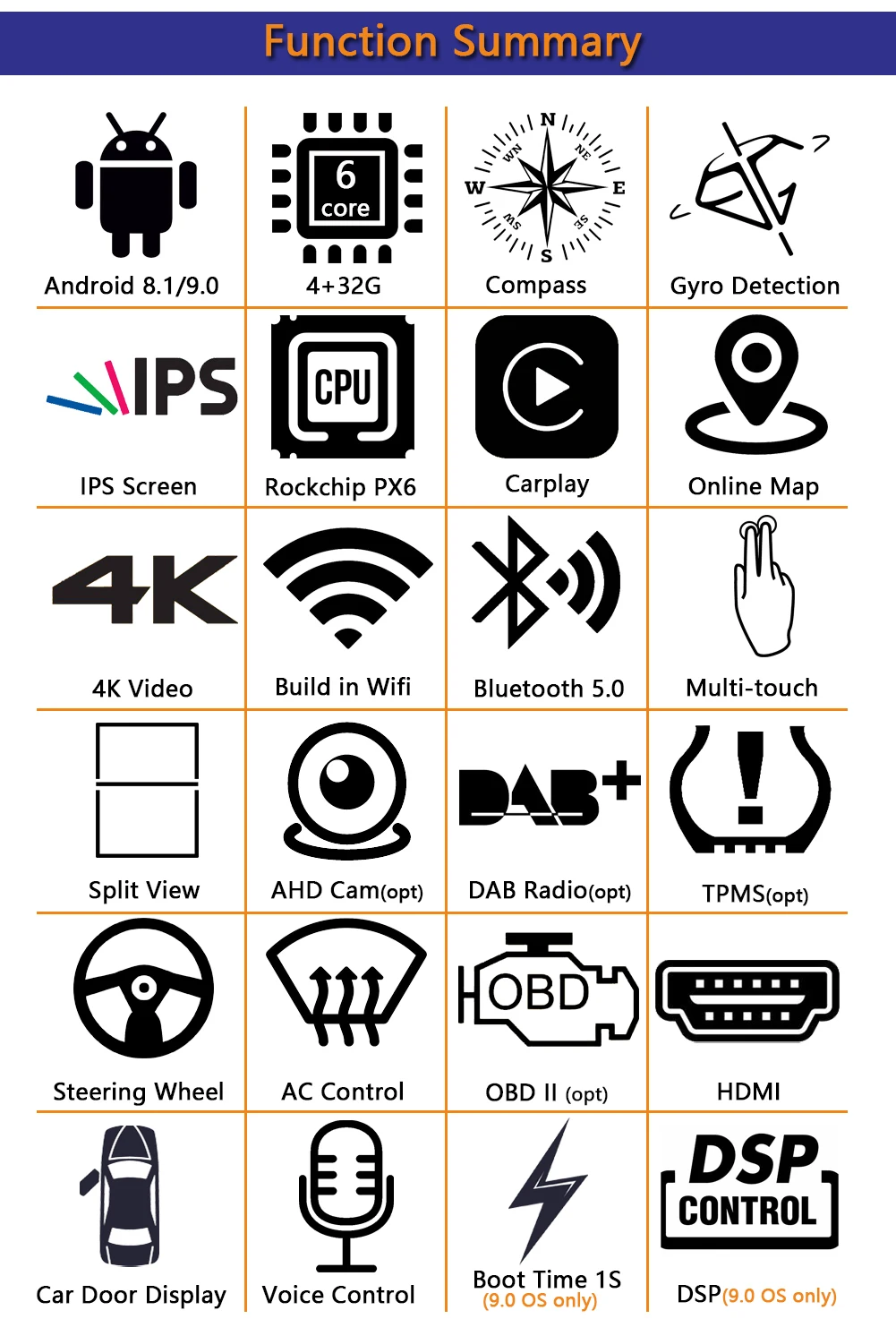 5. Система Android 9,0 оснащена DSP, быстрой загрузкой и функцией HDMI, но задняя камера Android 8,1 также может работать в режиме реального времени, когда головное устройство находится на загрузке.