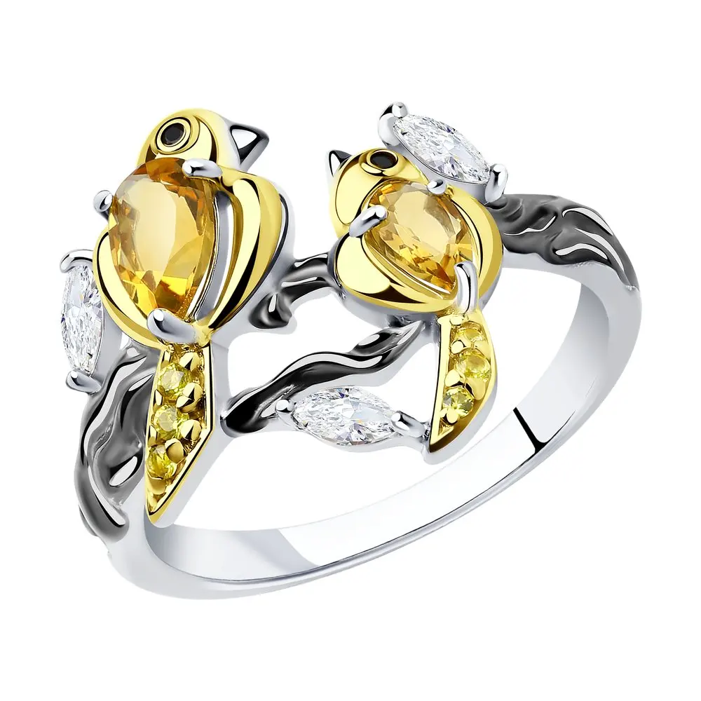 Кольцо «Птички» с цитринами и фианитами SOKOLOVКольцо «Птички» с цитринами и фианитами воплощает яркие сюжеты из живой природы. Вставки скомбинированы таким образом, чтобы подчеркнуть очертания и «оживить» образы канареек. Оригинальный дизайн, в котором нет ни одной лишней детали – настоящее произведение ювелирного искусства, которое можно купить по очень привлекательной цене.
