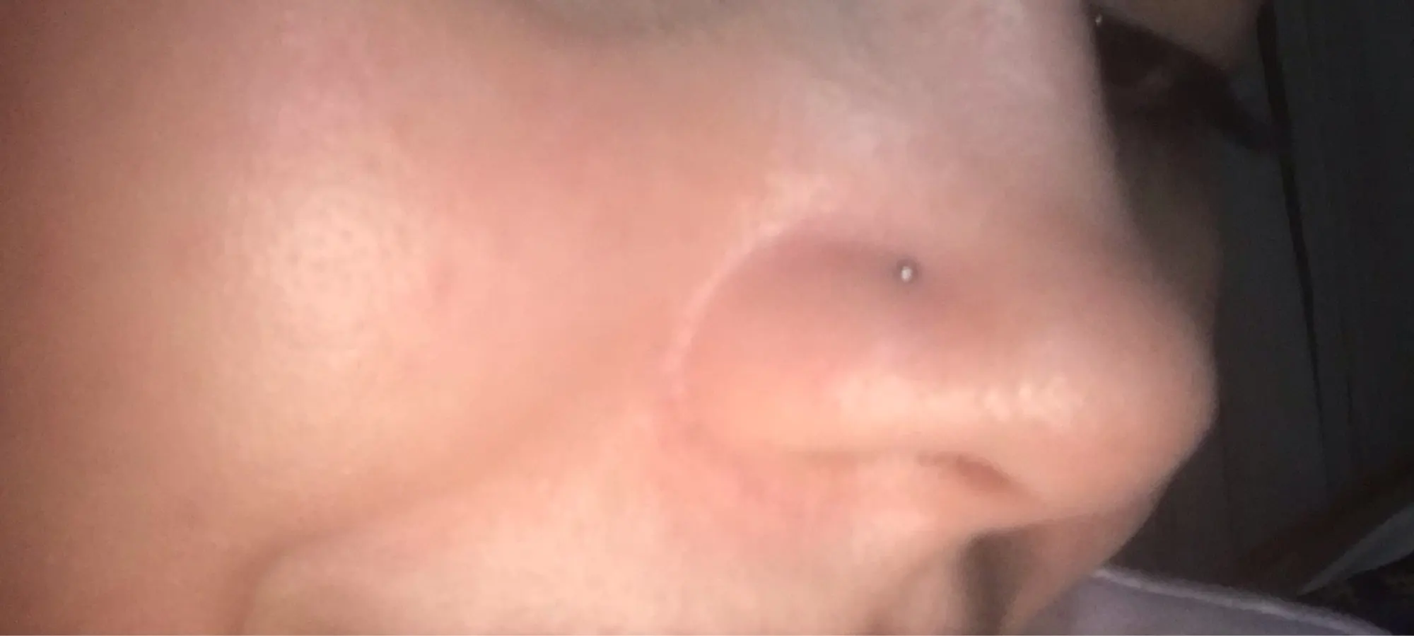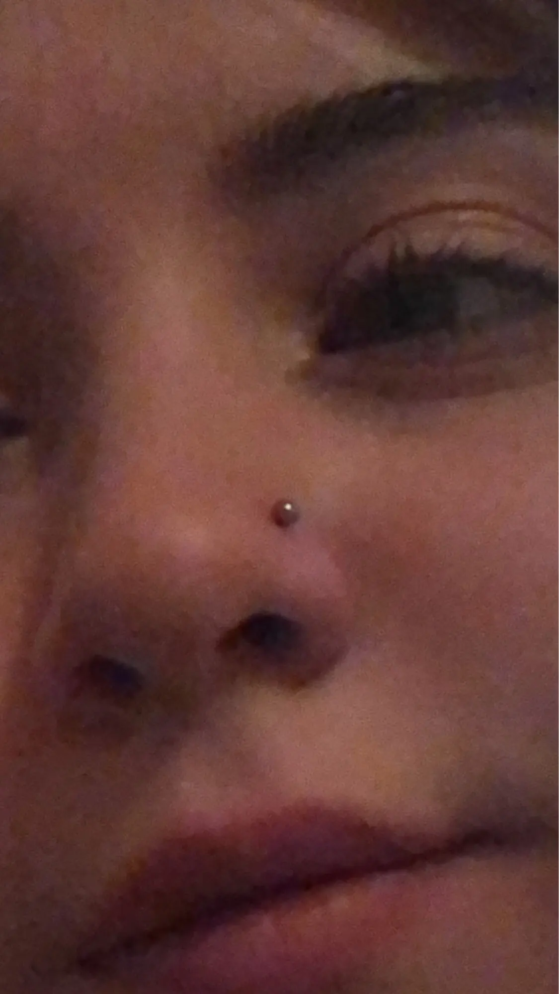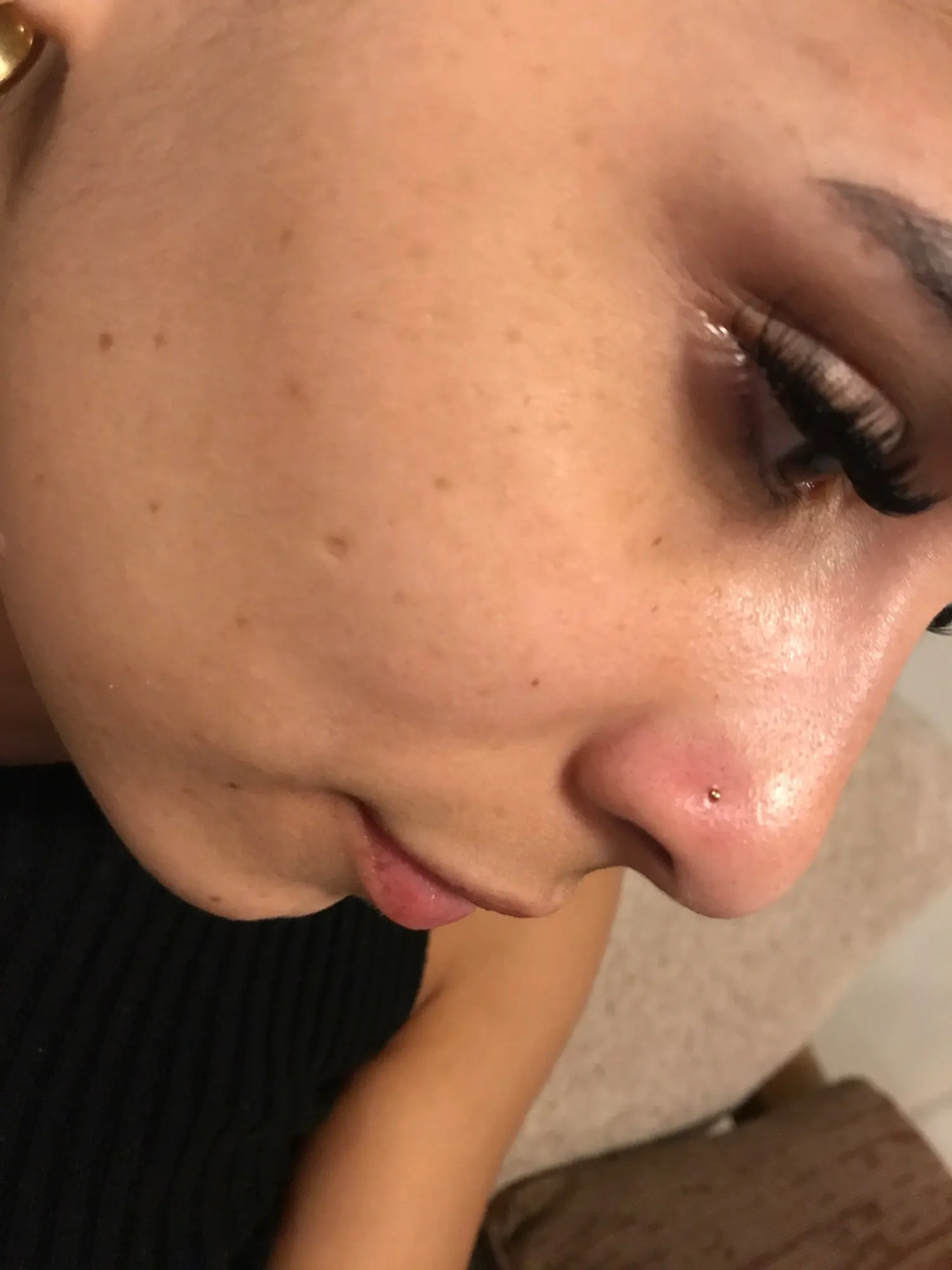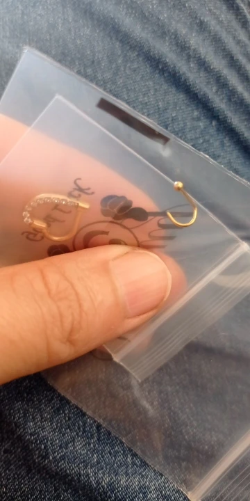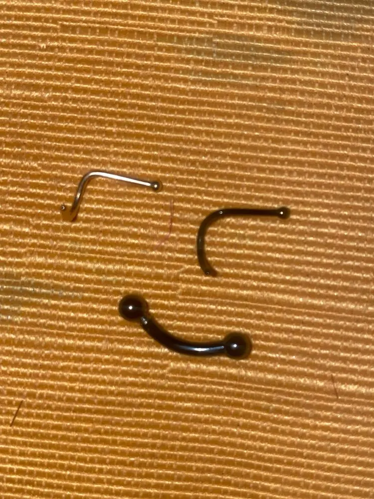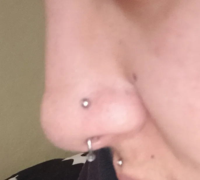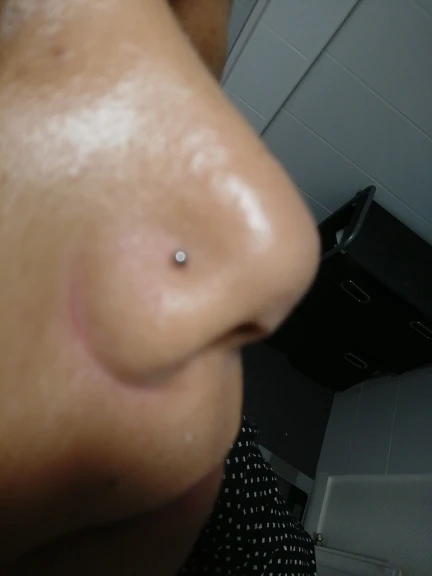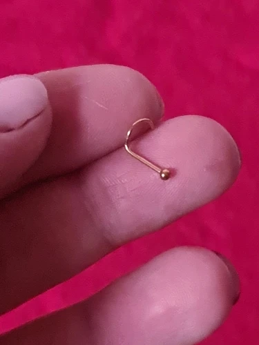 Сережка немного торчит из носа. А так все в порядке, нужно ее подогнуть.