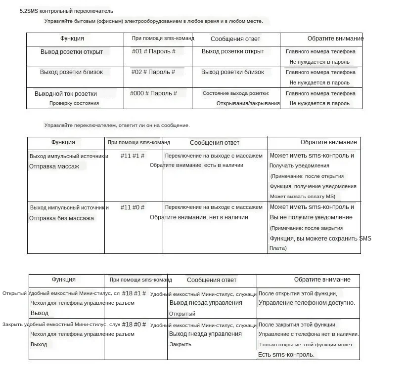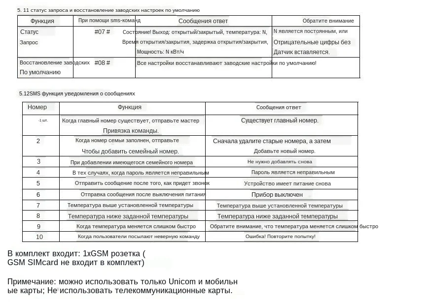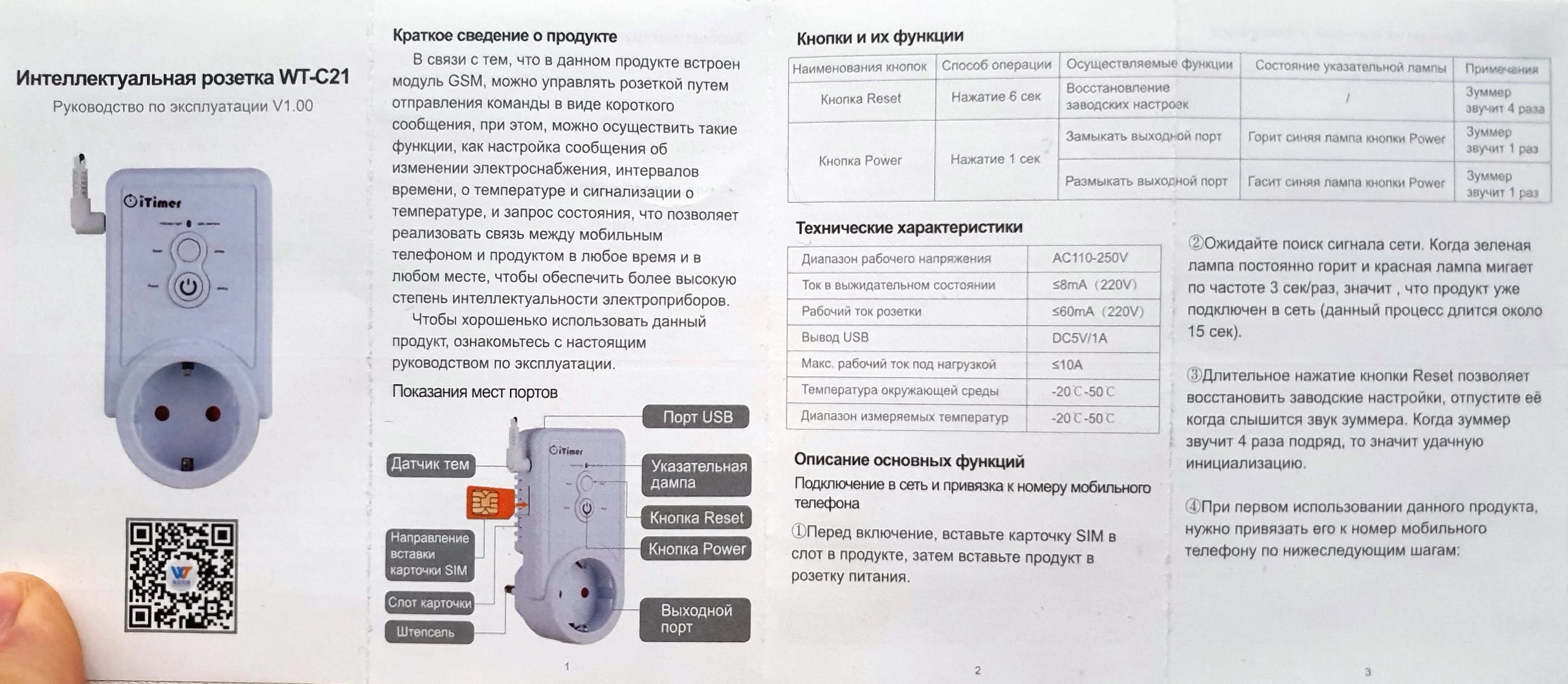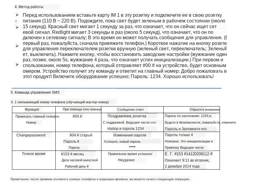 Доставка за 5 дней после оплаты СДЭК до квартиры в Москве. Тестирую второй день. Сим карту мегафона с тарифом "Умные вещи" использовать в данной розетке не получилось. Скорей всего, это проблема сим карты. Сим карта МТС заработала с первой попытки. С основного телефона розетка работает корректно и по звонку и по смс. С дополнительных телефонов работает только по звонку. По смс удалось добиться включения розетки с седьмого смс. Выключить не удалось. Возможно, это проблема моей розетки. Инструкция на русском. Но с очень мелким шрифтом. Пришлось искать в интернете. В остальном розеткой доволен.
