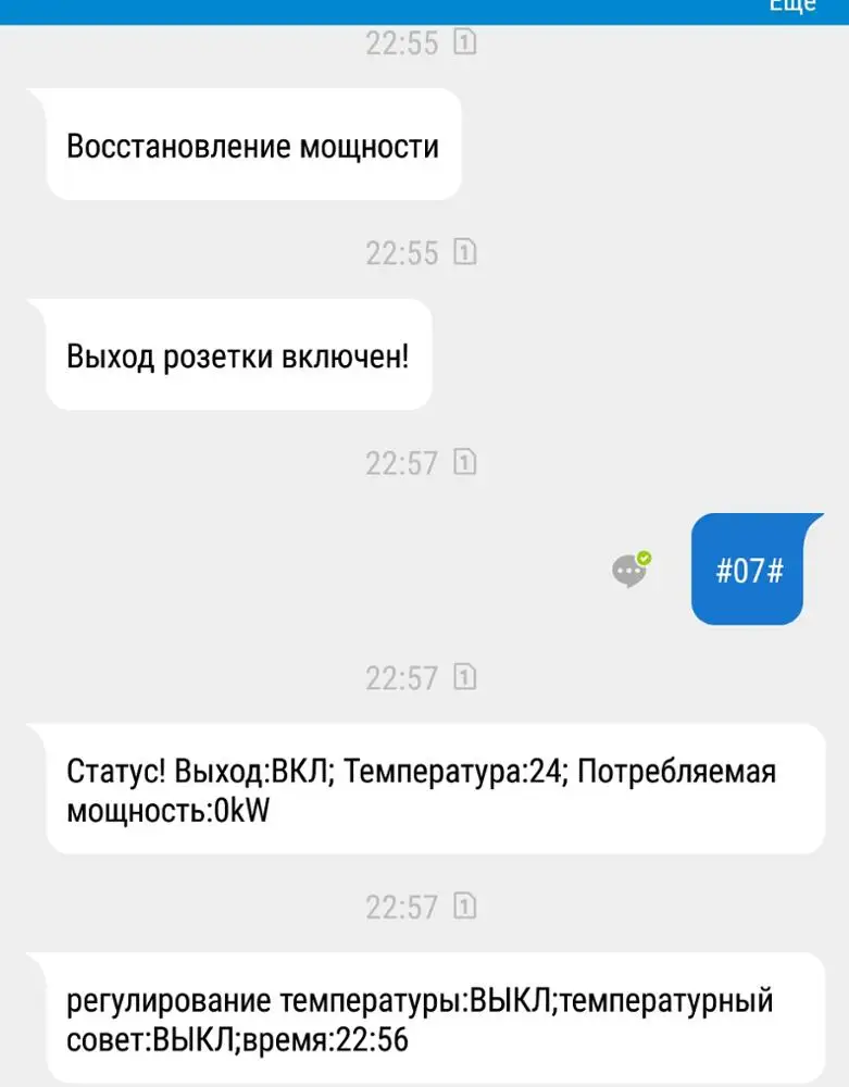 Всё отлично, работает. Настройка включения и выключения по температуре в инете не совсем правильны.Читайте бумажную инструкцию. #159#Режим#Нижн.Порог#Верх.Порог#0000#0000# - правильно.