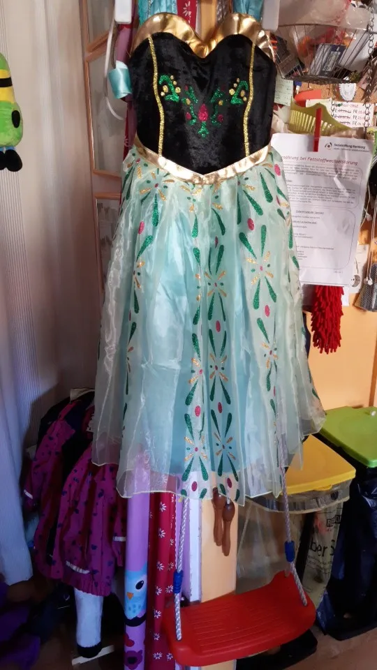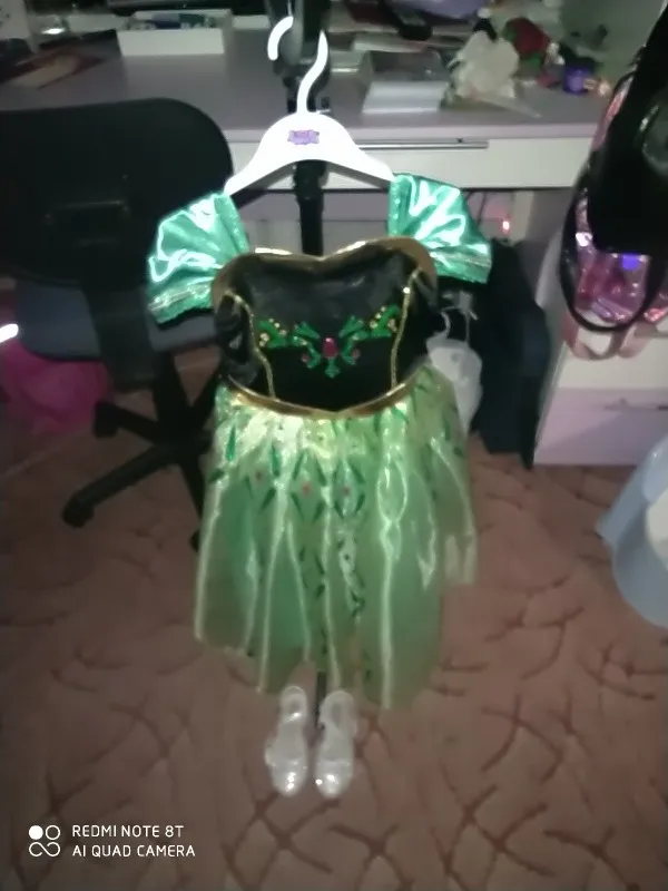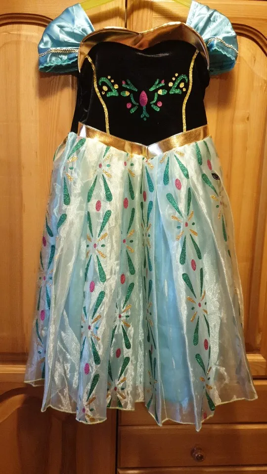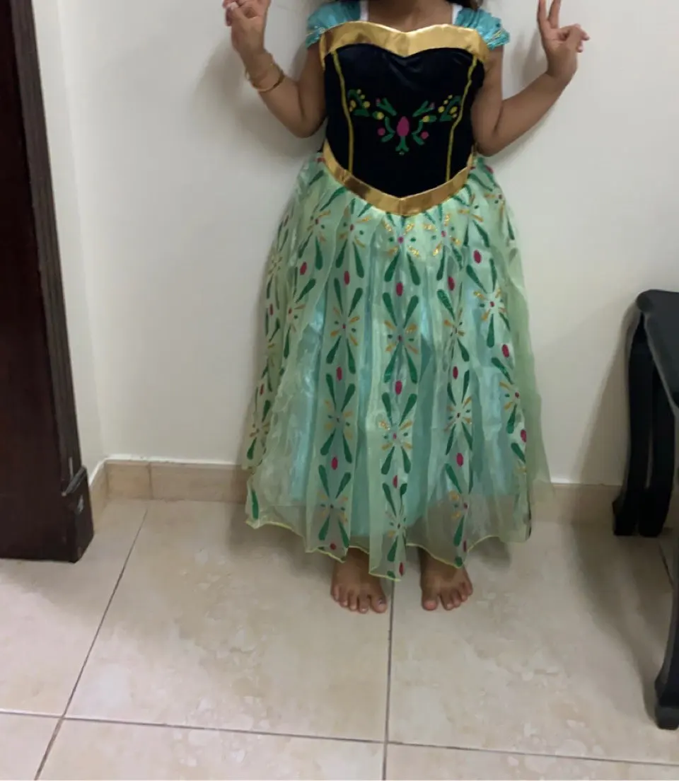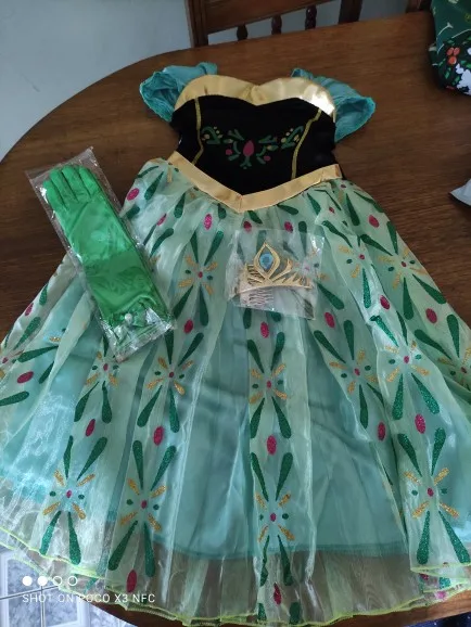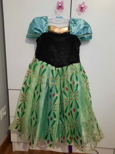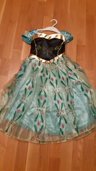 Платье выглядит так же, как на фотографии. Хорошее качество по отношению к цене. Мы взяли размер четыре, и он кажется правильным (на этикетке написано 110). Но мы не смогли доказать это, потому что это подарок. Платье прибыло довольно быстро.