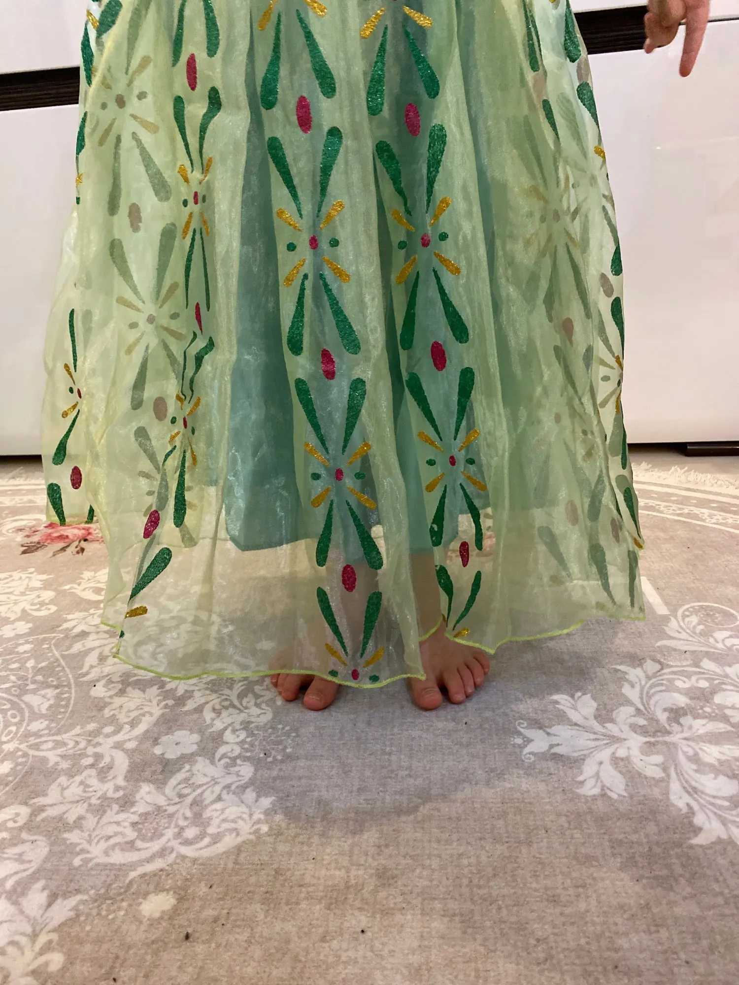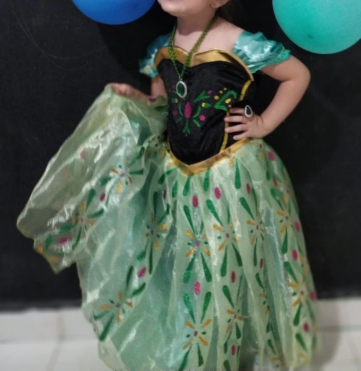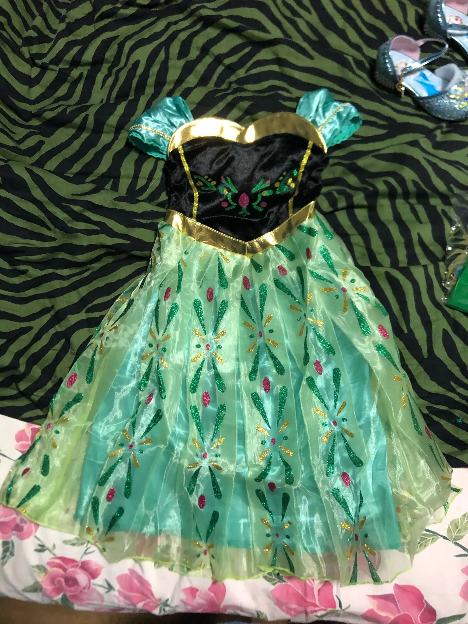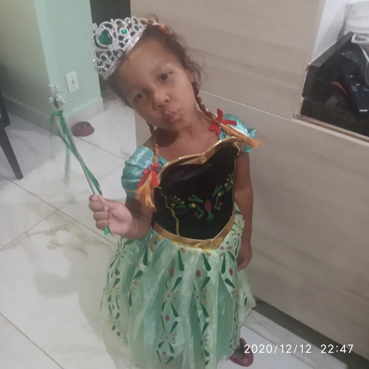 Платье выглядит так же, как на фотографии. Хорошее качество по отношению к цене. Мы взяли размер четыре, и он кажется правильным (на этикетке написано 110). Но мы не смогли доказать это, потому что это подарок. Платье прибыло довольно быстро.