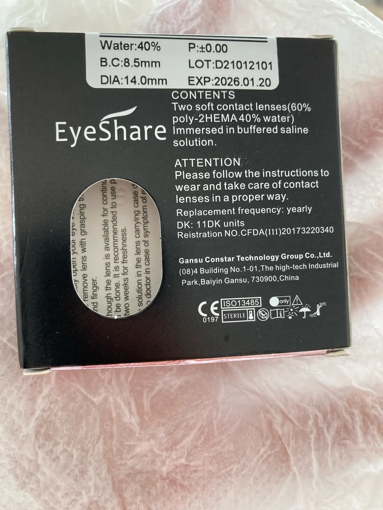 Особенности цветовых контактных линз:1. Бренд: EYESHARE2. Содержание воды: 40%3. Диаметр: 14 мм-14,2 мм.4. Оптическая центр Толщина: 0,08 мм5. Основной материал: гема6. Базовая радиус изгиба: 8,5 мм.7. Твердость линз: мягкая8. Частота замены: годовые одноразовые.9. Упаковка: 1 пара (2 Объективы) с одним контактным лицом чехол (бесплатно).