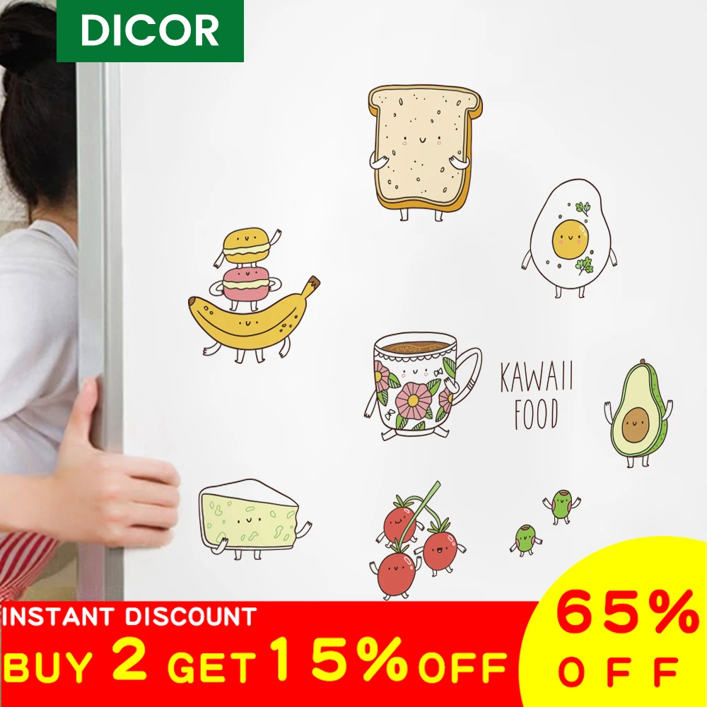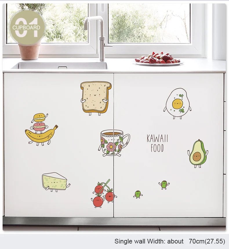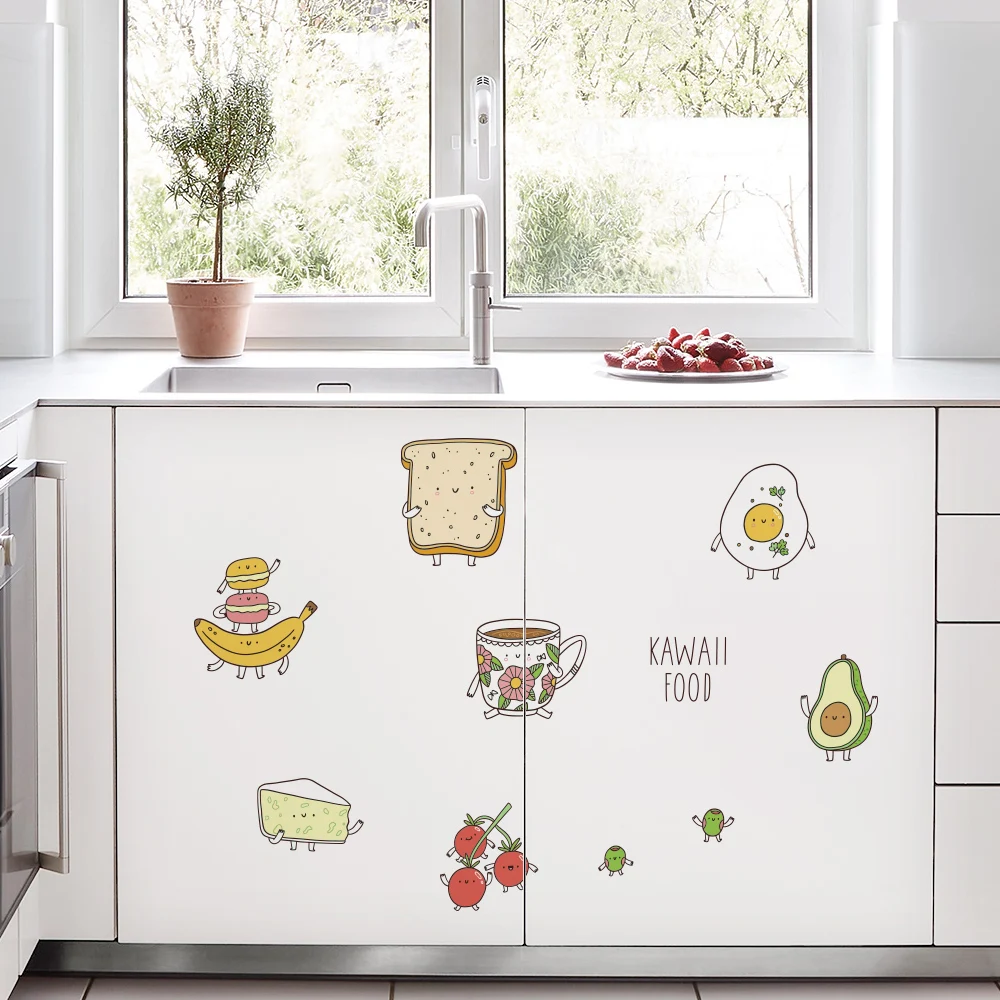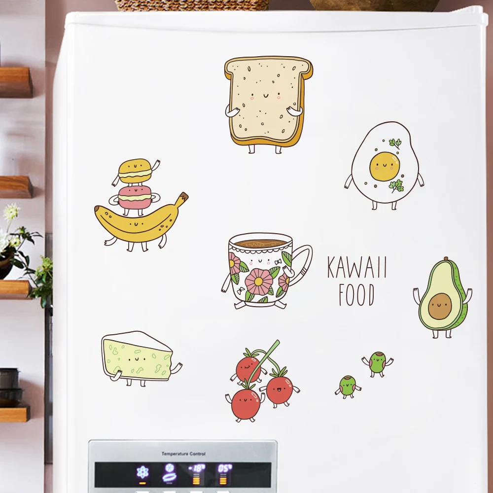 Милые Мультяшные Наклейки на стены с едой для украшения кухни, холодильника, самоклеющиеся виниловые наклейки на окна Водонепроницаемая Наклейка на стену