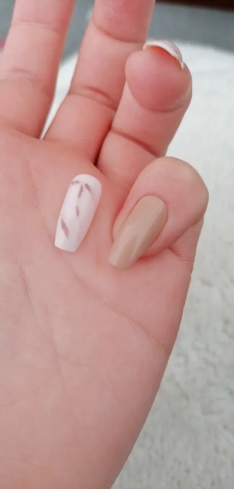 Они красивые и прибыли в установленное время (доставка через aliexpress saver shipping), они поставляются с клеем, чтобы приклеить их, и я также купил отдельно. В комплект входят 24 ногтя, но единственная ошибка, которую я обнаружила, заключается в том, что они не поставляются по 2 каждого размера одного цвета, например, два размера. 9 но один в кофе, а другой в мраморе, тогда вам придется приспосабливать другой размер симметричными руками