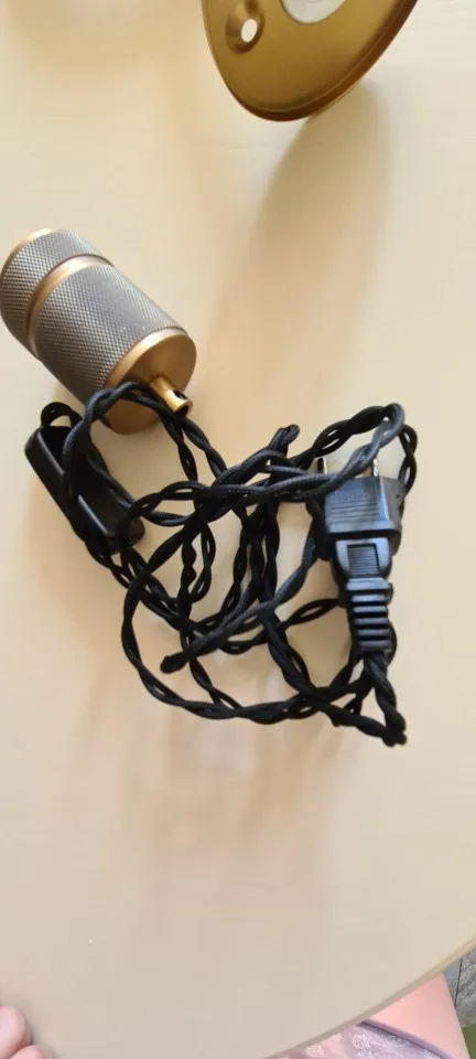 В целом выглядит прилично. Деталь с кольцом оказалась очень лёгкой, т. к. сварена из тонкостенной полой трубки. Есть ощущение, что при желании могу погнуть руками. Так что использовать конечно только для очень лёгкого, как раз вот для лампочки и подойдёт. Провод тоже выглядит хлипко. Но вроде больше тут и не надо. Жаль, что выключатель не ретро и не разборного типа...