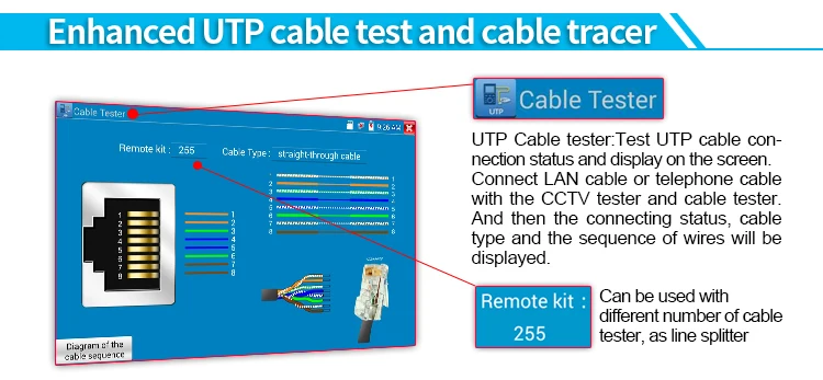 ●Улучшенный тестер кабелей, кабель UTP, телефонный кабель и т. Д. Заказ и тест на подключение, может сохранить отчет о тестировании, если специальный номер, необходимо настроить