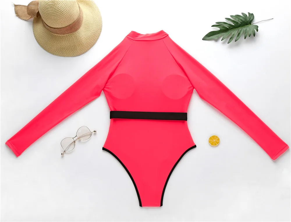 Флуоресцентный зеленый женский купальник с длинным рукавом, слитный купальник на молнии, коврик для серфинга, ремень, одежда для дайвинга