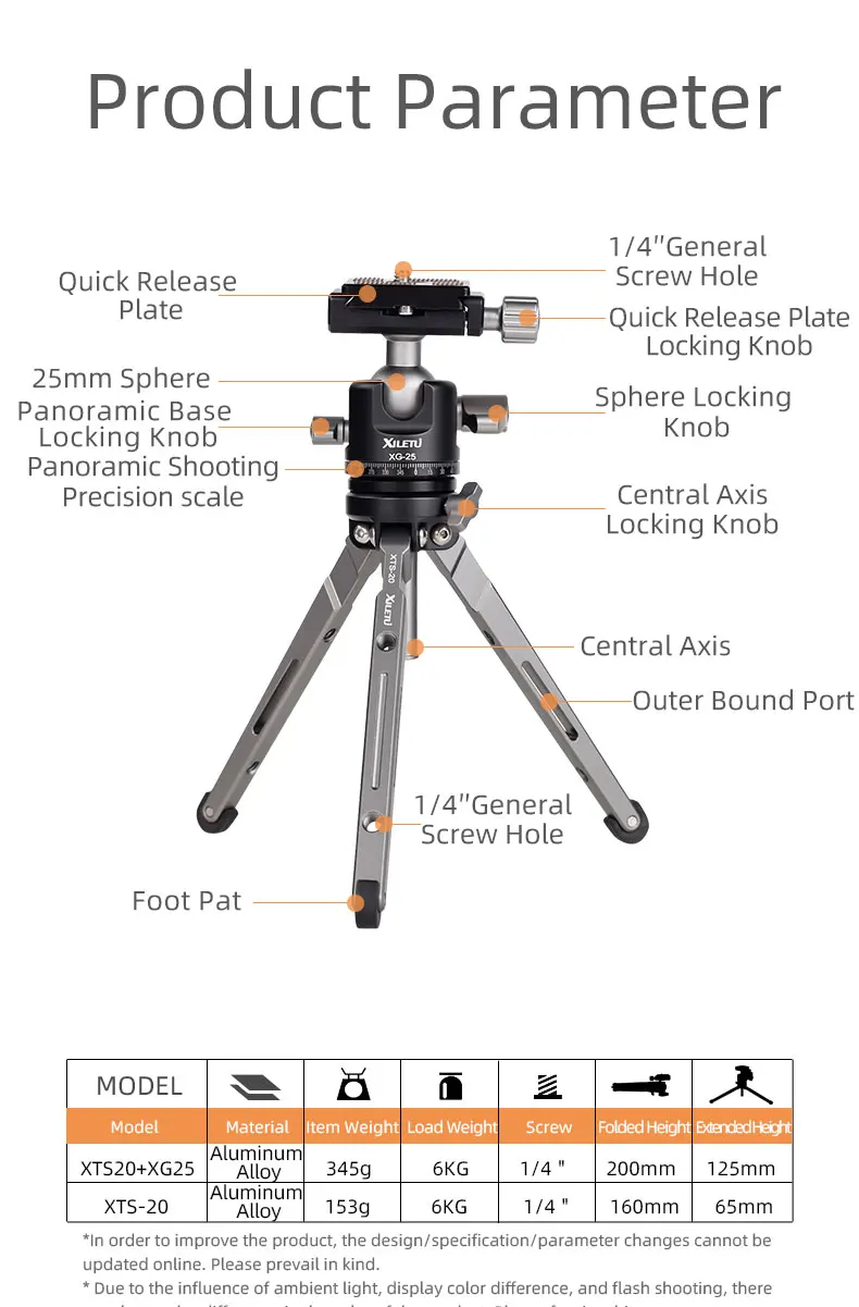 Компактный алюминиевый штатив XIELTU XTS-20 с съемной шаровой головкой, вращение на 360 градусов, штатив из алюминиевого сплава для GoPro DSLR