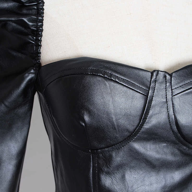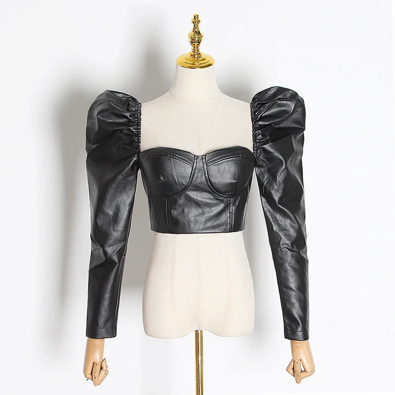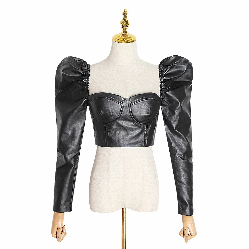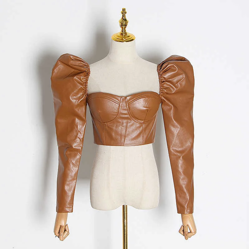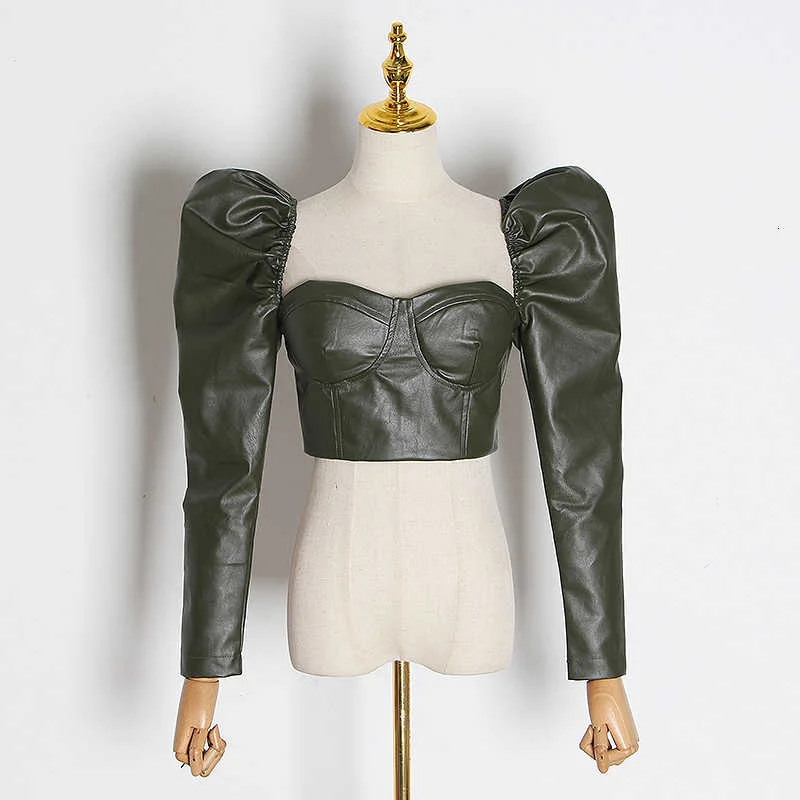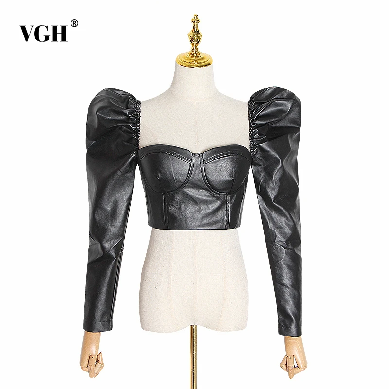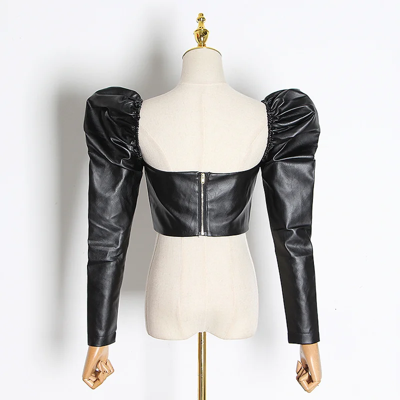 Женская винтажная короткая блузка VGH из искусственной кожи с открытой спиной, туника с квадратным воротником и длинными рукавами-фонариками, женская модная одежда 2020
