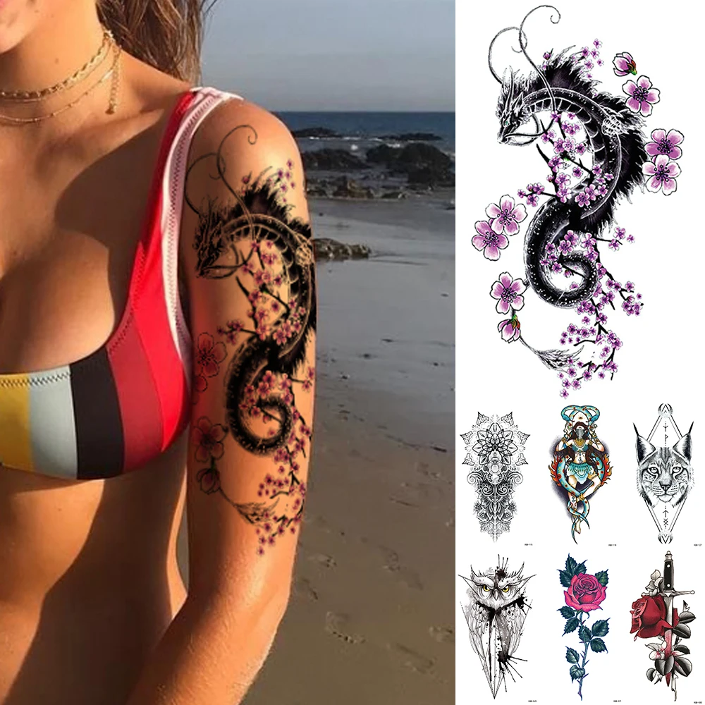Временные татуировки с изображением дракона, наклейки с изображением розы лотоса, кружевные цветы, водонепроницаемые татуировки с изображением змеи, боди-арта, поддельные татуировки для мужчин и женщин
