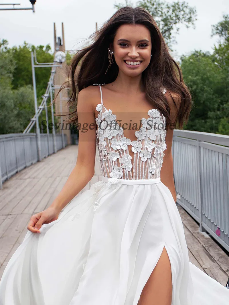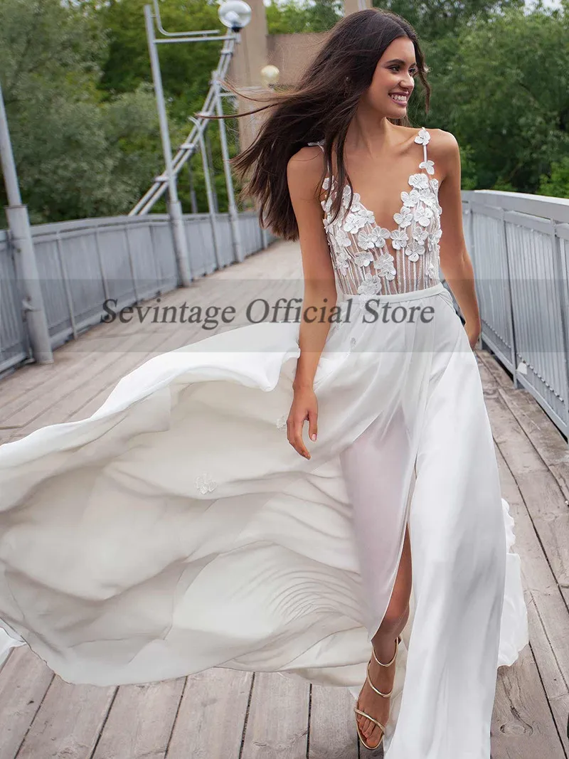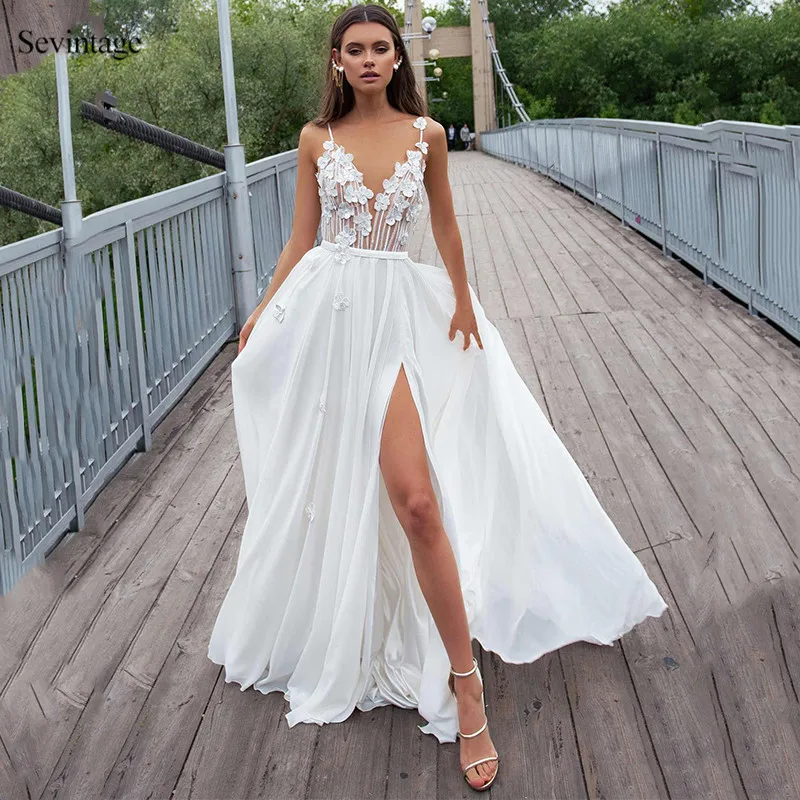 Шифоновое пляжное свадебное платье Sevintage, с высоким разрезом, на бретелях-спагетти, с 3D цветами, платье для невесты с открытой спиной, платье принцессы для невесты