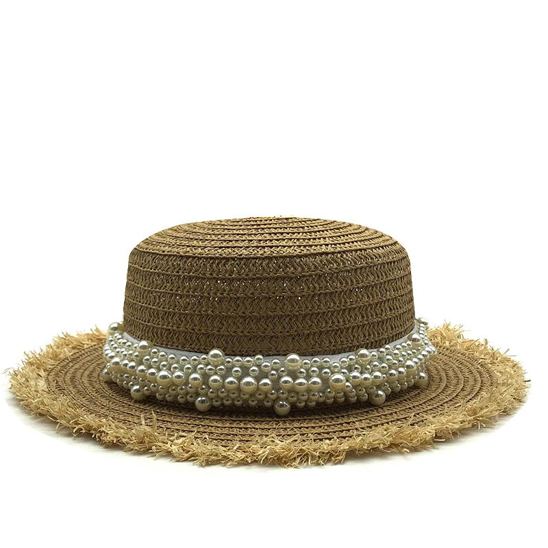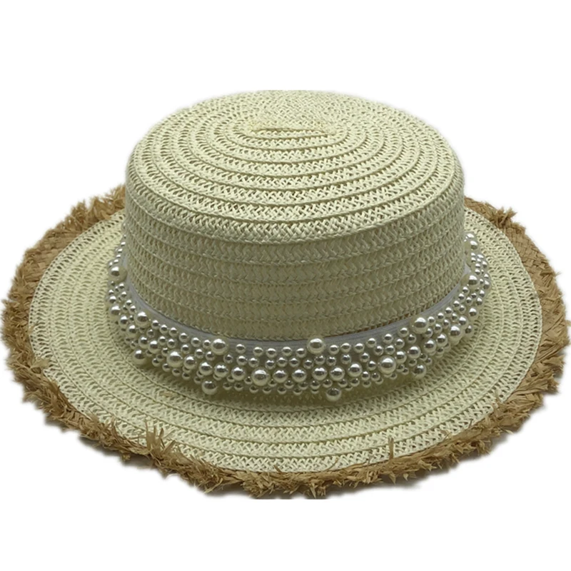 Шляпка Соломенная женская с плоской подошвой, дышащая пляжная шляпа от солнца, с жемчугом, роскошная, летняя, весенняя