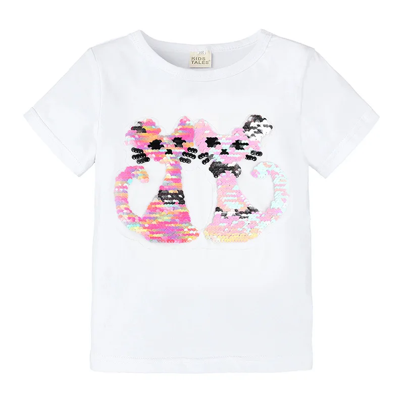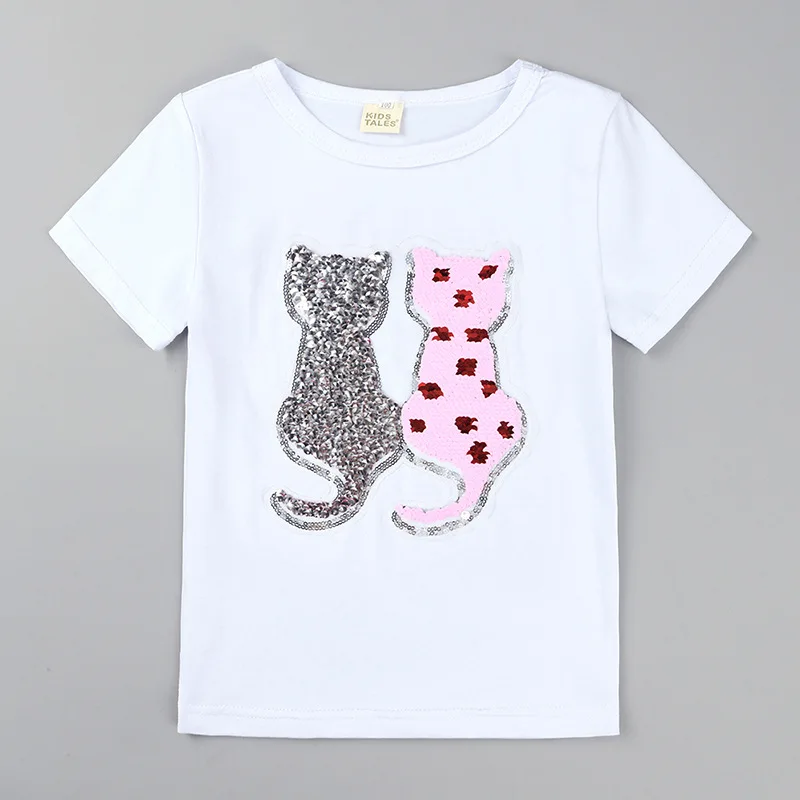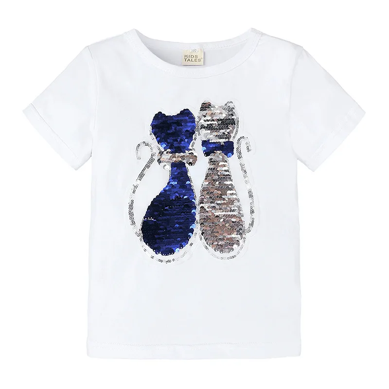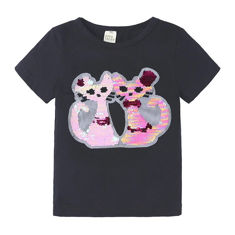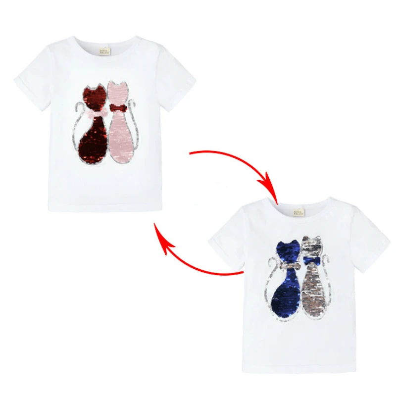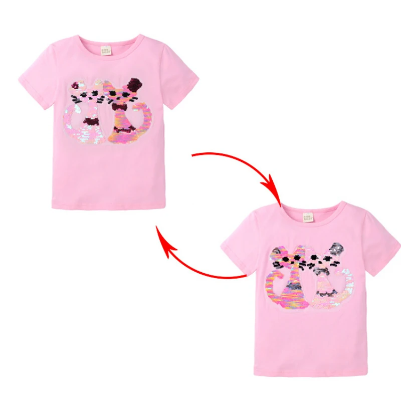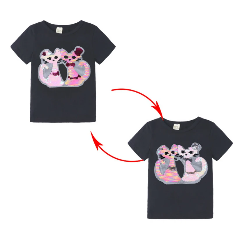 Летние футболки для девочек, футболка с блестками, меняющая цвет, с мультяшным котом и звездой, переключаемая Футболка с блестками, детская одежда для подростков