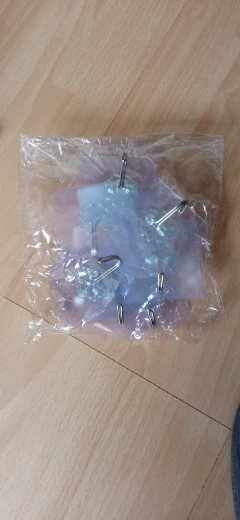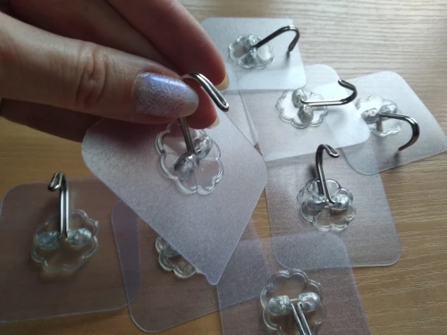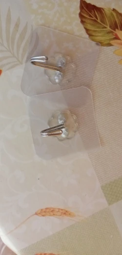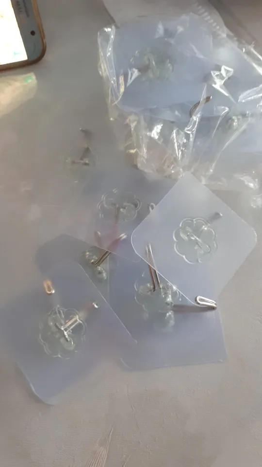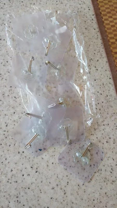 Крючки как в описании. Идут по два в упаковке. Снимается защитный слой и клеится на стену крючок. Пока висит, надеюсь продержится долго. Продавец общительный, ответственный. Только шла посылка долго, почти два месяца, но успела к концу защиты.