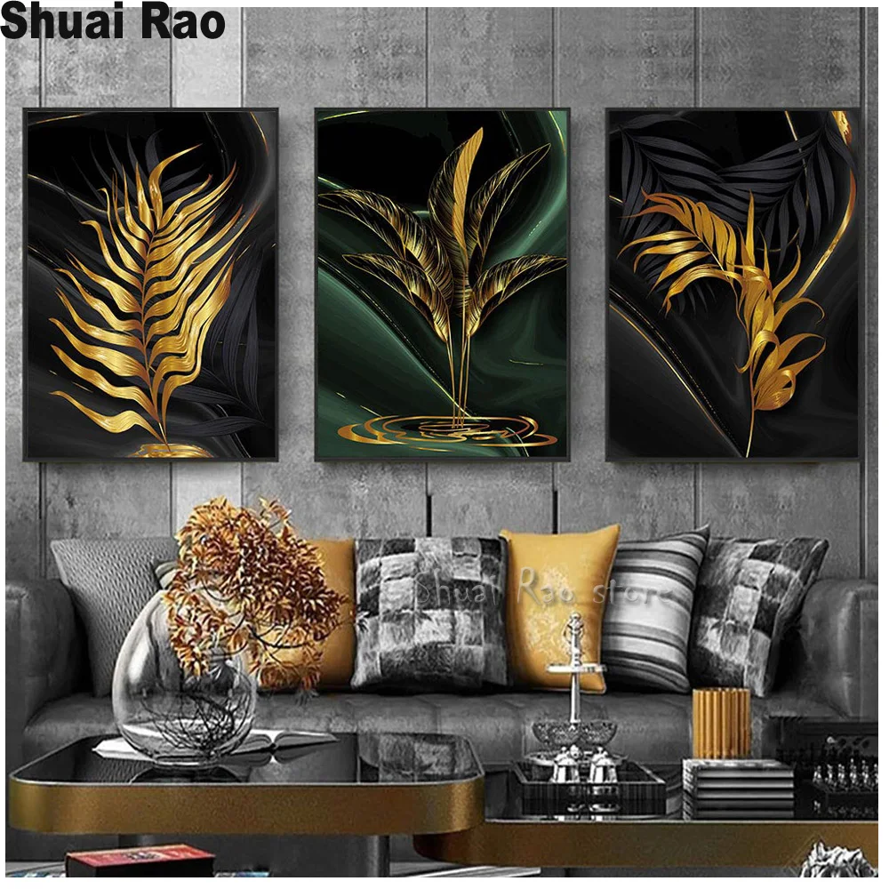 Картина с листьями, Золотая настенная живопись, 3 шт., алмазная картина, полная новинка, 2020, набор мозаики с крестиком, вышивка, 100% круг, дрель,