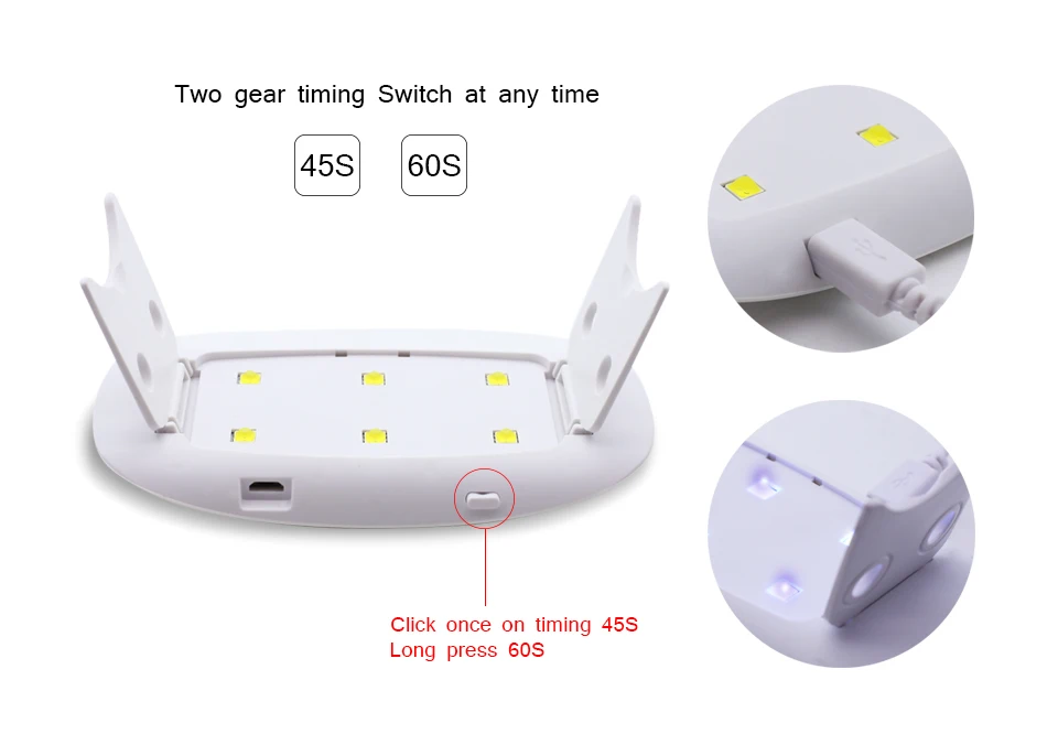 -Тип изделия: Сушилка для ногтей-Цвет: белый, розовый-Максимальная мощность: 6 Вт-Лечение всех гелей: УФ-гель, светодиодный гель, полигель-Время установки: Нажмите один раз на время 45S, длительное нажатие 60S Что в коробке?1x лампа для ногтей1x Руководство пользователя1x USB линия
