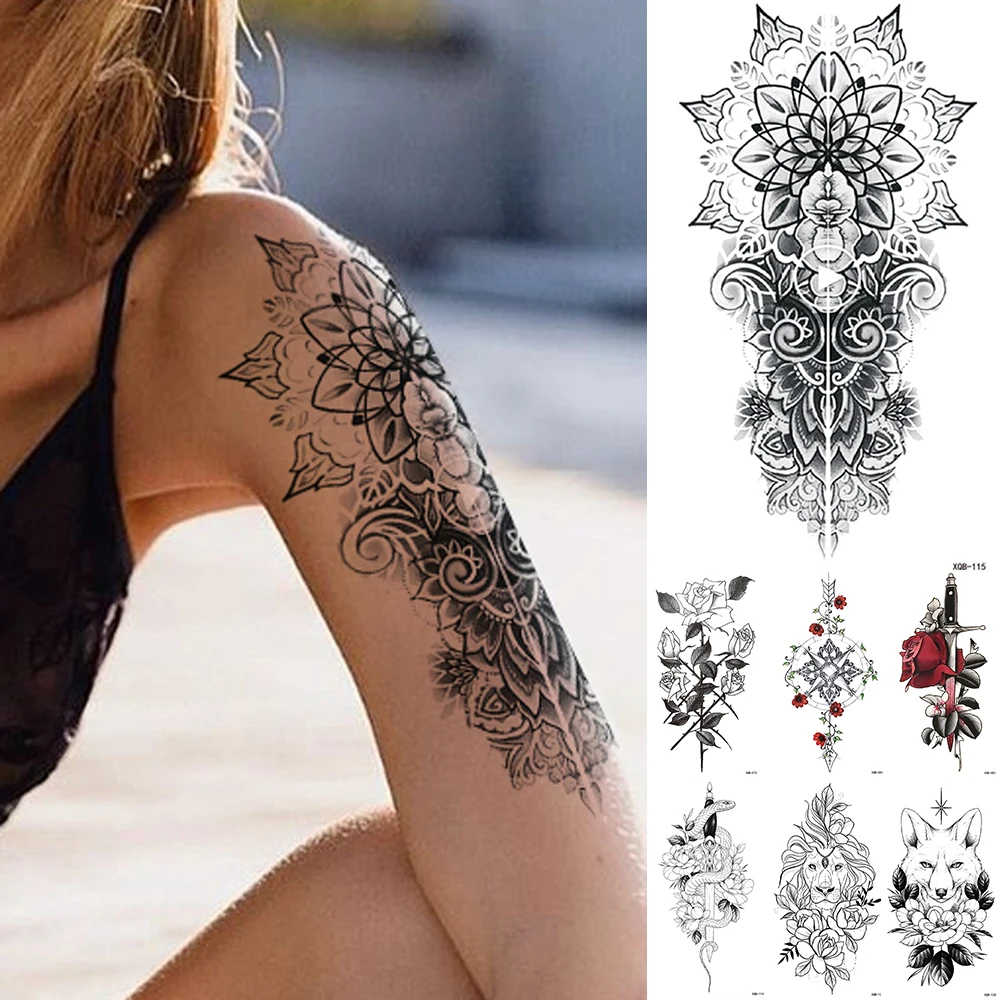Временная тату-наклейка с цветами и розой, водонепроницаемая вспышка, кружевная татуировка с лисой, львом и деревом, боди-арт, татуировка с фальшивым рукавом для женщин