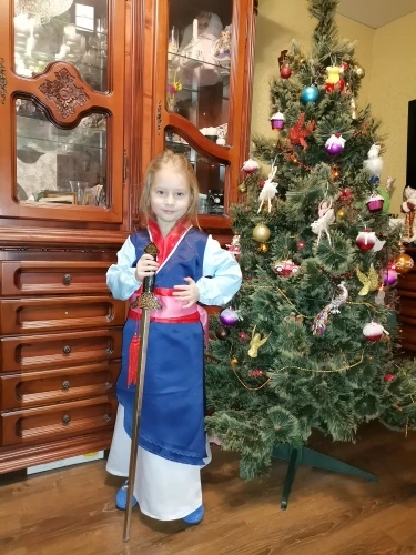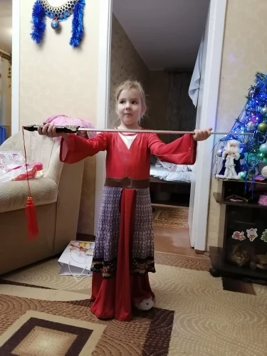 Просто шикарный костюм. У нас есть костюм Эльзы, Елены принцессы Авалора, Рапунцель, но этот костюм исполнен на другом уровне. Дочка ростом 115см примерно, костюм 140, велик, но не критично, все на завязочках, пплечах норм, смотрите фото. Мне кажется на 140 было бы маловато в рукавах. Меч железный! Все соседские мальчишки плачут, хотят такой