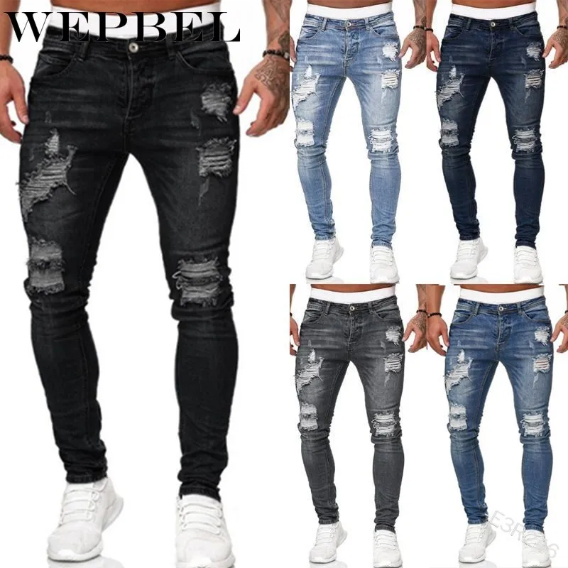 Мужские тренировочные брюки WEPBEL, пикантные джинсовые брюки с дырками, повседневные, на лето и осень, мужские рваные узкие брюки, верхняя одежда для байкеров